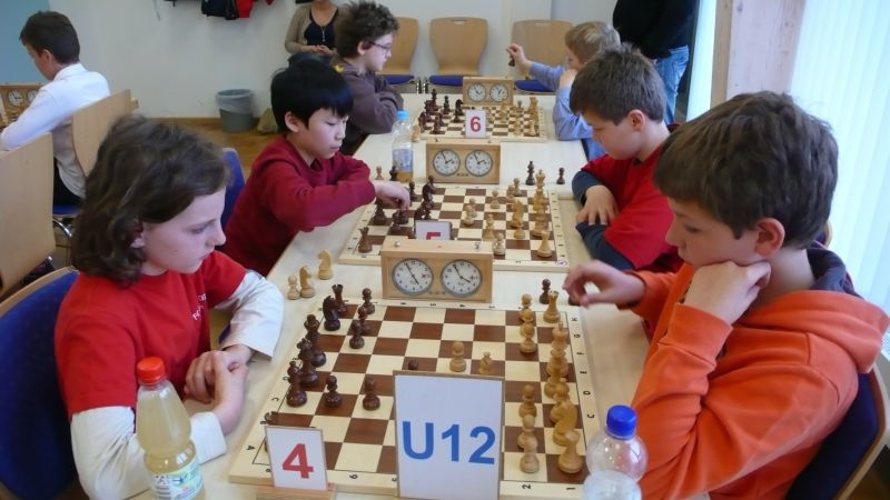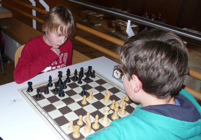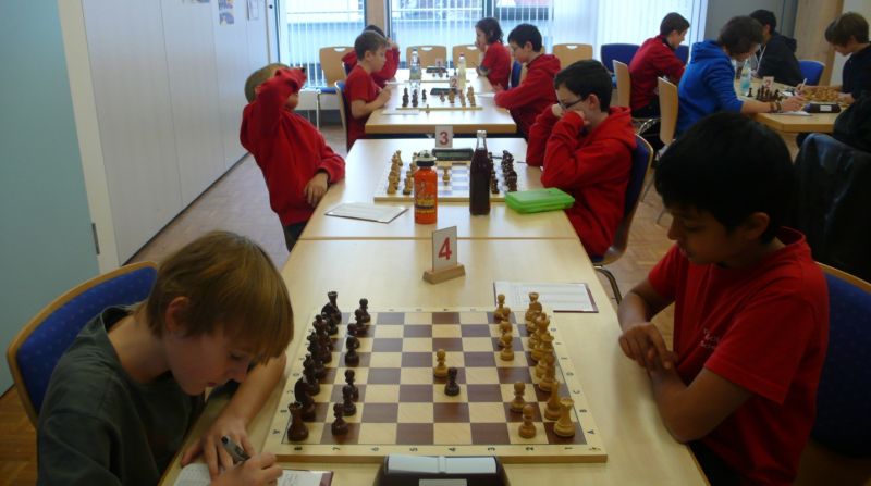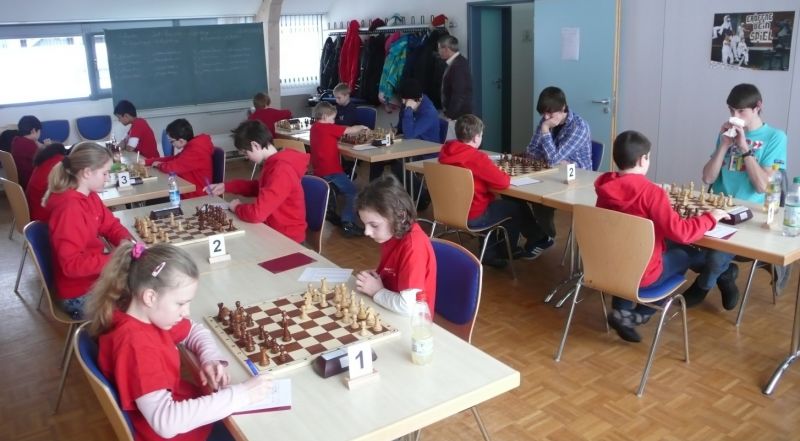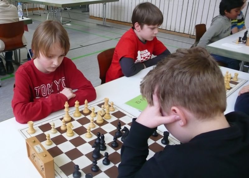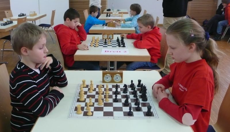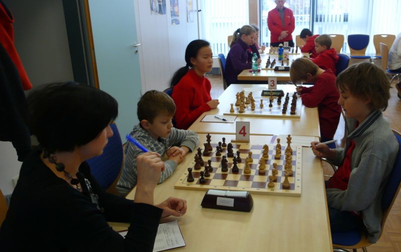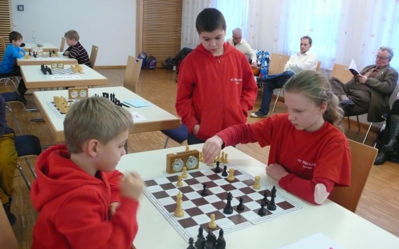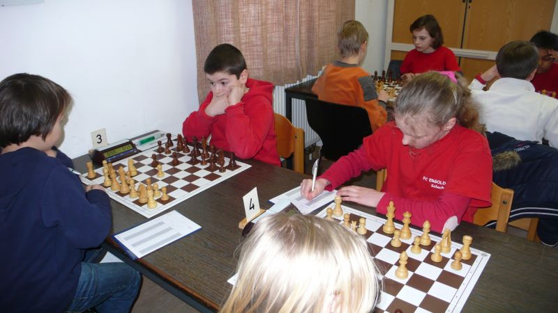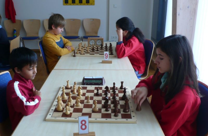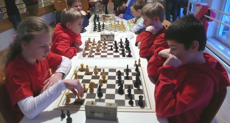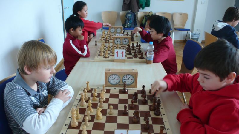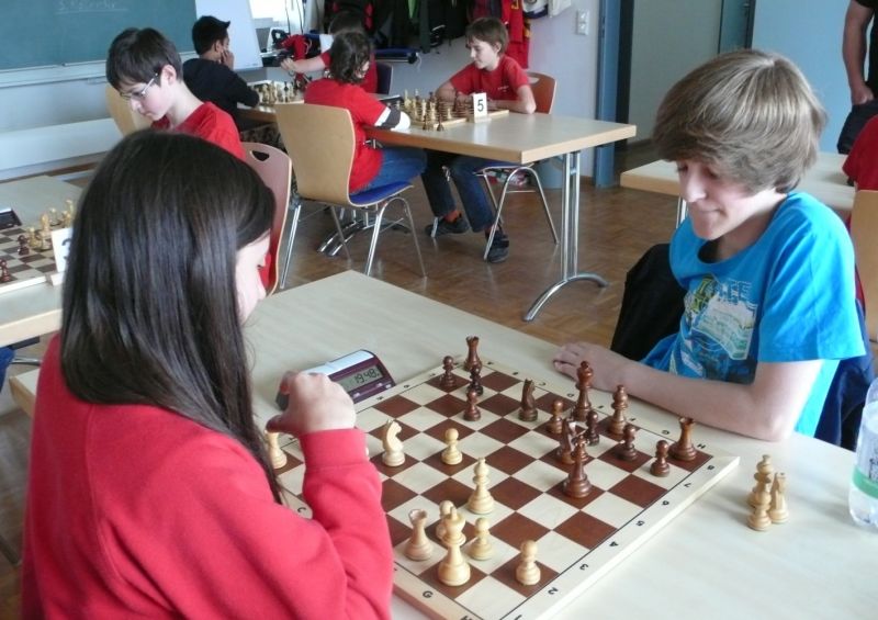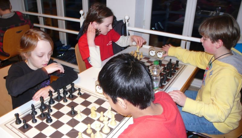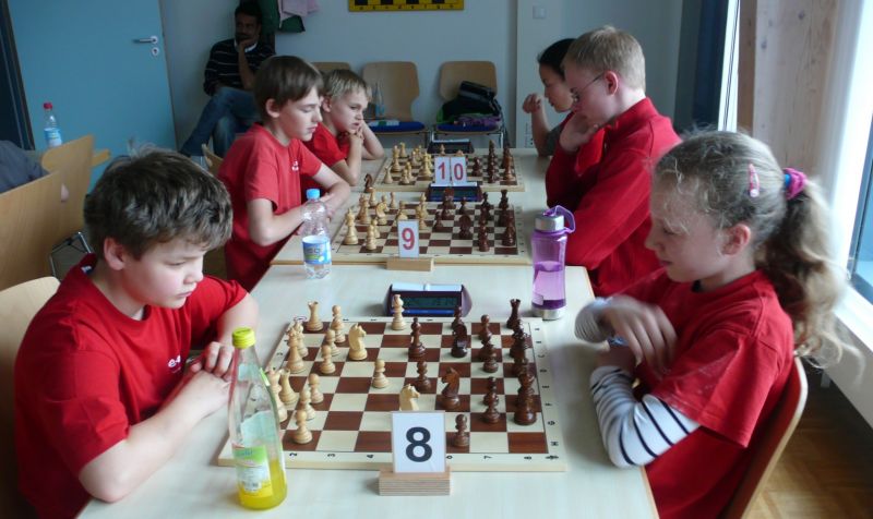 Doch etwas kurios, dass unsere Vierte gegen die Dritte die Oberhand behielt, aber in diesem Bereich entscheidet natürlich die Tagesform. Dass Maria Kühne an Brett 1 gegen Sebastian Astner gewann, war eigentlich keine Überraschung. Nach einer etwas unglücklich gewählten Eröffnung von Sebastian eroberte Maria das Zentrum und gewann im 11. Zug eine Figur. Im 20. Zug war zwar diese zurückgewonnen und ein Mehrbauer erzielt, aber ein brillanter Zug (für ein 9-jähriges Mädchen!) brachte Maria klare Vorteile. Nach einem Verteidigungsfehler von Sebastian im 29. setzte Maria im 31. Zug nach 55 Minuten Matt. An Brett 2 gewann Lukas Stessun gegen Michelle Reif zunächst ebenfalls im 11. Zug eine Figur und nach 14 Zügen eine zweite, aber im 24. Zug übersah Michelle ein einzügiges Doppelschachmatt. Im 35. Zug war sie zu "fresssüchtig". Nachdem sie bereits die Dame von Lukas erbeutet hatte, wollte sie sich auch noch den letzten Turm schnappen, übersah aber dabei, dass Lukas nun ein Bäuerlein durchbrachte. Damit lag Lukas wieder mit einem Läufer im Vorteil. Nach 62 Zügen und 1:03 Std. hatte Lukas glücklich gewonnen. Auch Anni Zhang und Clemens Ottmair lieferten an Brett 3 eine sehr spannende Partie ab. Im 10. Zug stellte Anni eine Figur ein, das gleiche passierte Clemens im 24. Zug. Im 26. Zug schenkte Anni erneut einen Figur her, und Clemens schien dem Sieg zuzusteuern. Aber im 30. ein einziger falscher Königszug kostete Clemens die Partie nach 34 Zügen und 1:35 Std. Dramatik an Brett 4: Jakob Klein übersah im 25. Zug eine Läufergabel des 7-jährigen "Ersatzmanns" Felix Handschuh und verlor dadurch einen Springer und stellte kurz darauf noch einen Turm ein. Aber dann gingen Felix über 30 Züge lang die Ideen aus und es folgte ein eher planloses Hin- und Hergeschiebe, bevor er im 71. Zug die Damen tauschen und nach 89 Zügen Matt setzen konnte.