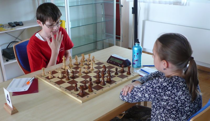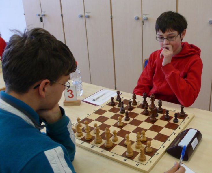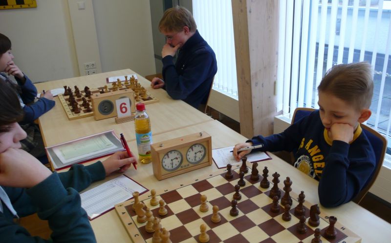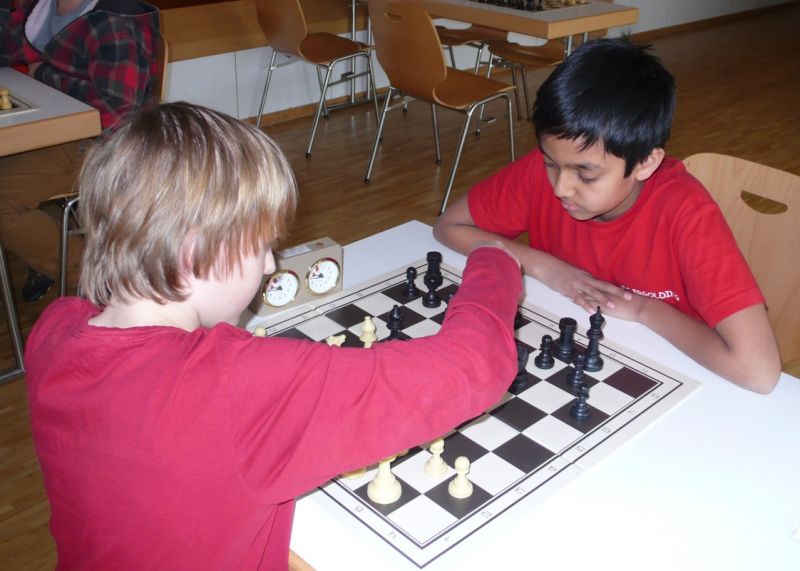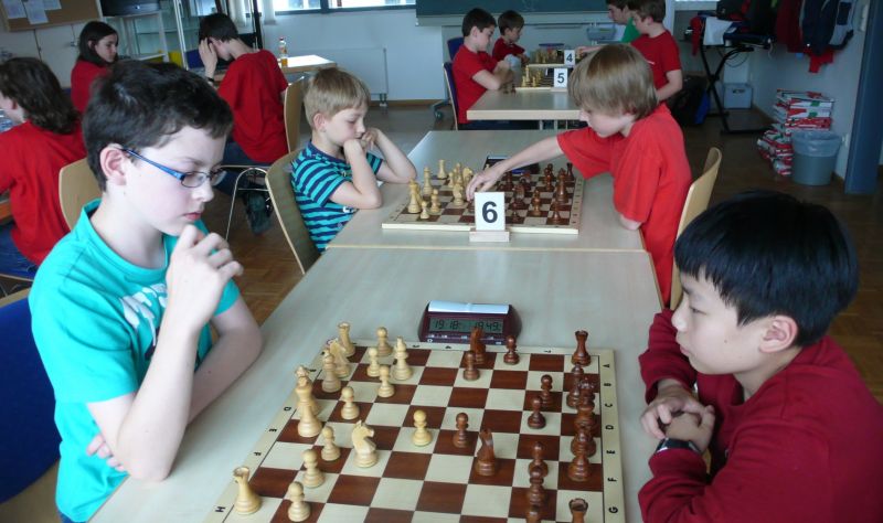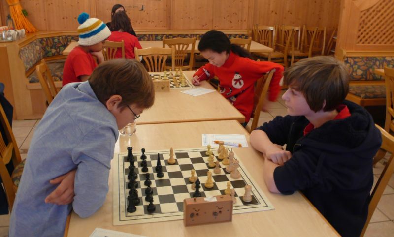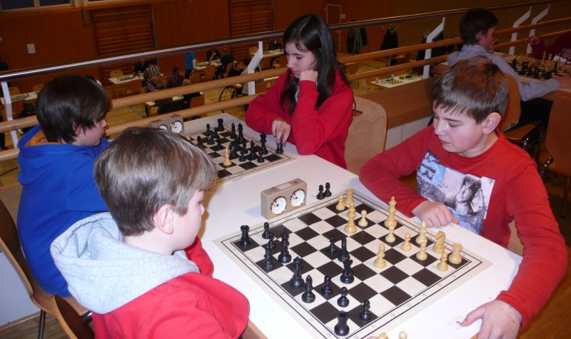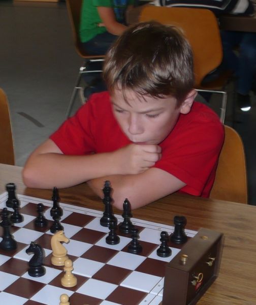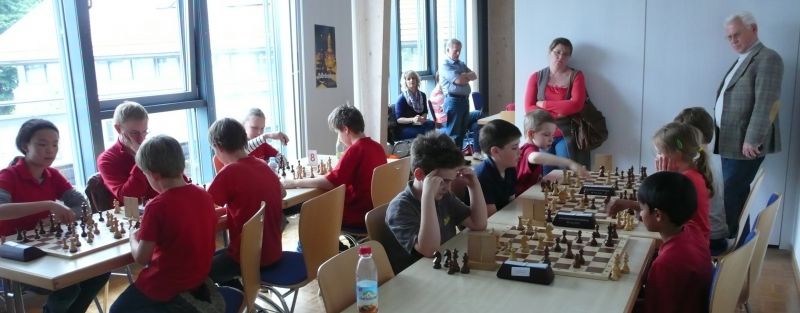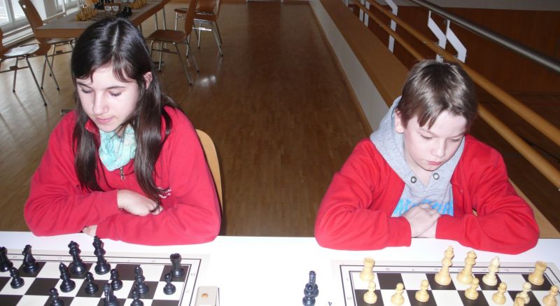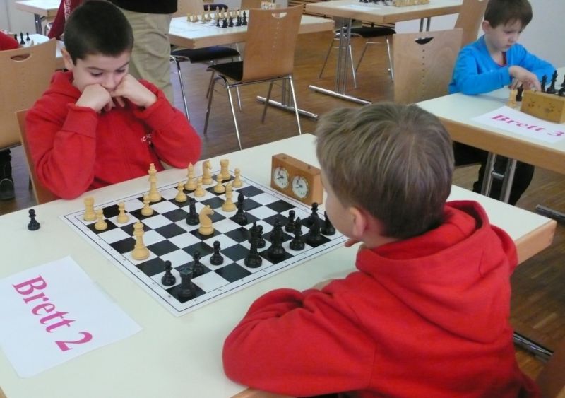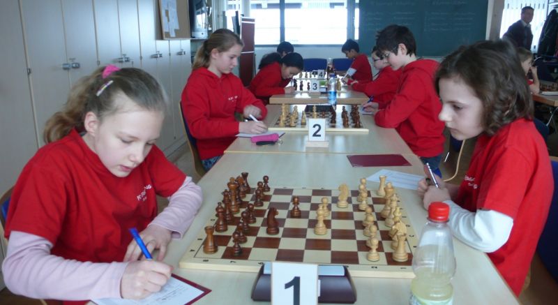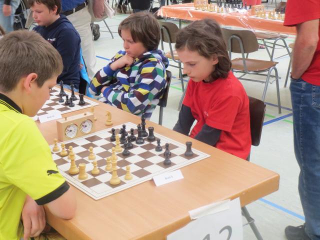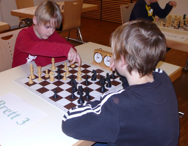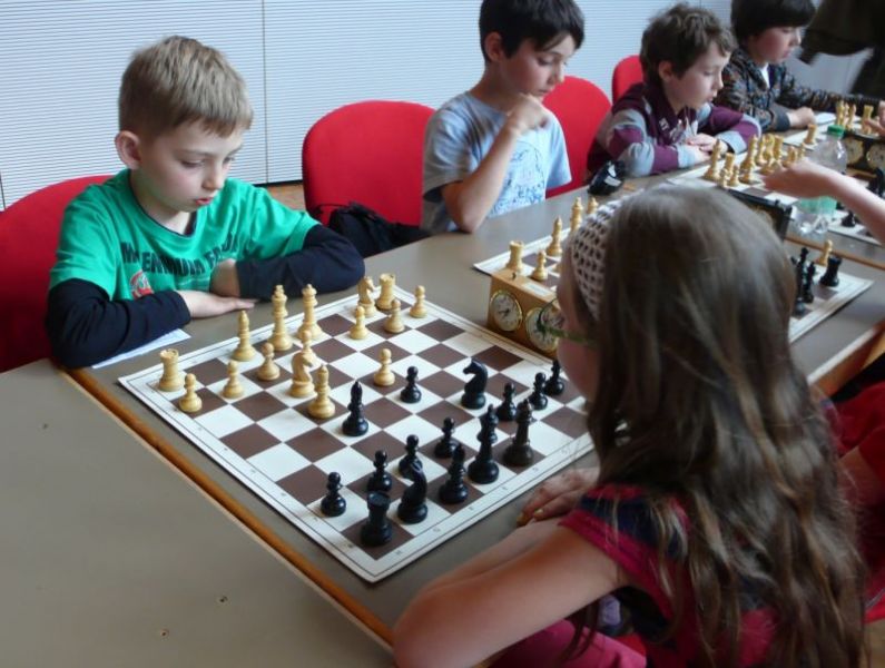 Doch etwas kurios, dass unsere Vierte gegen die Dritte die Oberhand behielt, aber in diesem Bereich entscheidet natürlich die Tagesform. Dass Maria Kühne an Brett 1 gegen Sebastian Astner gewann, war eigentlich keine Überraschung. Nach einer etwas unglücklich gewählten Eröffnung von Sebastian eroberte Maria das Zentrum und gewann im 11. Zug eine Figur. Im 20. Zug war zwar diese zurückgewonnen und ein Mehrbauer erzielt, aber ein brillanter Zug (für ein 9-jähriges Mädchen!) brachte Maria klare Vorteile. Nach einem Verteidigungsfehler von Sebastian im 29. setzte Maria im 31. Zug nach 55 Minuten Matt. An Brett 2 gewann Lukas Stessun gegen Michelle Reif zunächst ebenfalls im 11. Zug eine Figur und nach 14 Zügen eine zweite, aber im 24. Zug übersah Michelle ein einzügiges Doppelschachmatt. Im 35. Zug war sie zu "fresssüchtig". Nachdem sie bereits die Dame von Lukas erbeutet hatte, wollte sie sich auch noch den letzten Turm schnappen, übersah aber dabei, dass Lukas nun ein Bäuerlein durchbrachte. Damit lag Lukas wieder mit einem Läufer im Vorteil. Nach 62 Zügen und 1:03 Std. hatte Lukas glücklich gewonnen. Auch Anni Zhang und Clemens Ottmair lieferten an Brett 3 eine sehr spannende Partie ab. Im 10. Zug stellte Anni eine Figur ein, das gleiche passierte Clemens im 24. Zug. Im 26. Zug schenkte Anni erneut einen Figur her, und Clemens schien dem Sieg zuzusteuern. Aber im 30. ein einziger falscher Königszug kostete Clemens die Partie nach 34 Zügen und 1:35 Std. Dramatik an Brett 4: Jakob Klein übersah im 25. Zug eine Läufergabel des 7-jährigen "Ersatzmanns" Felix Handschuh und verlor dadurch einen Springer und stellte kurz darauf noch einen Turm ein. Aber dann gingen Felix über 30 Züge lang die Ideen aus und es folgte ein eher planloses Hin- und Hergeschiebe, bevor er im 71. Zug die Damen tauschen und nach 89 Zügen Matt setzen konnte.