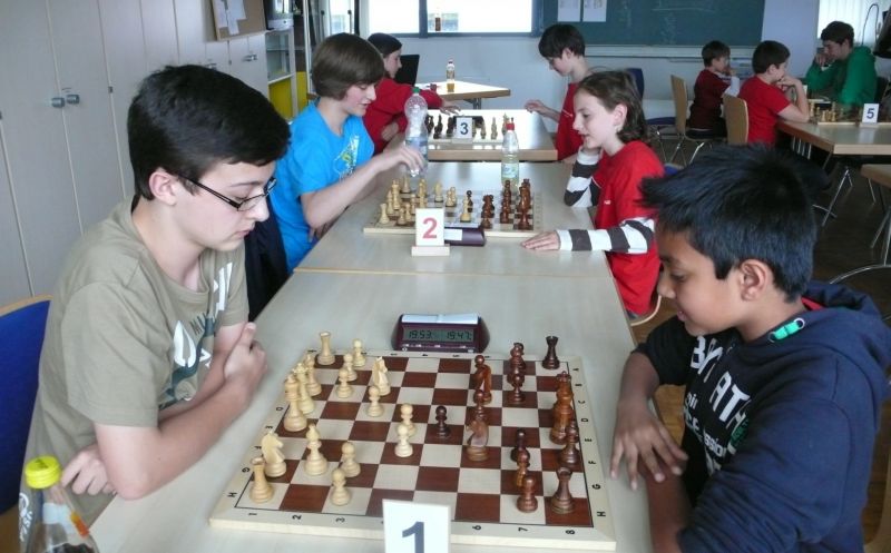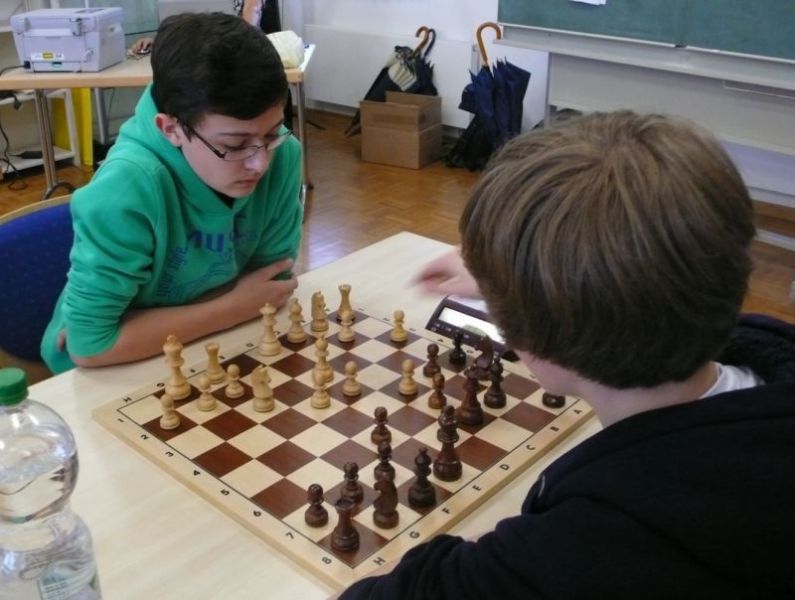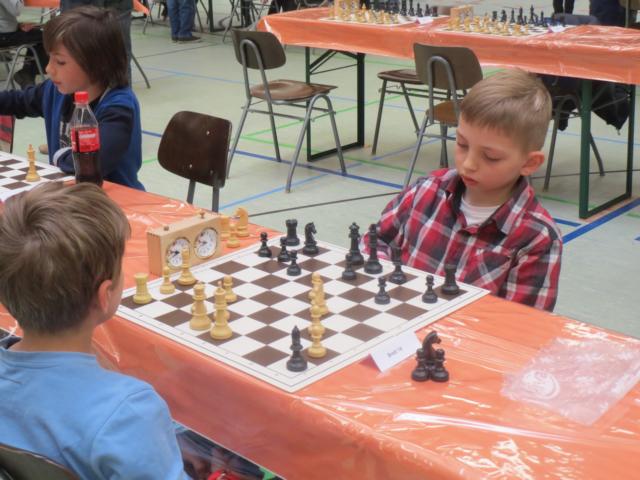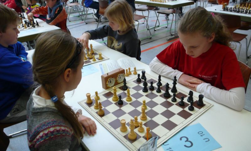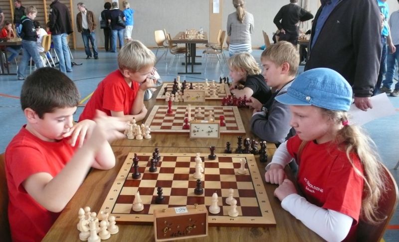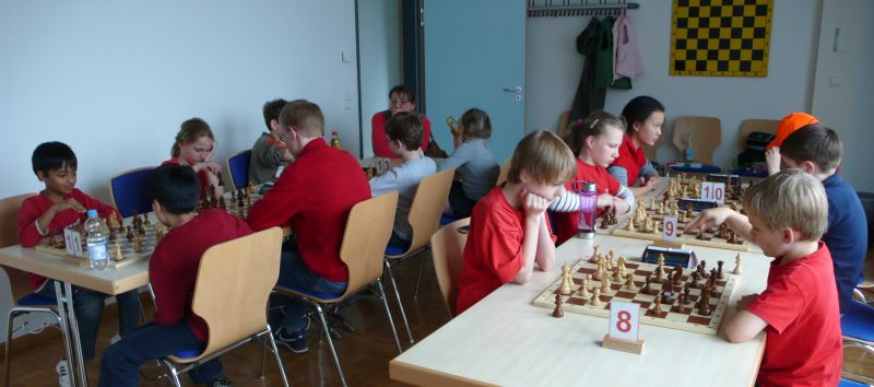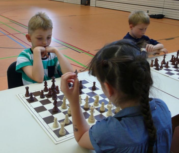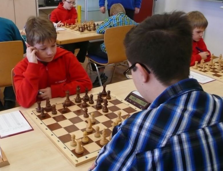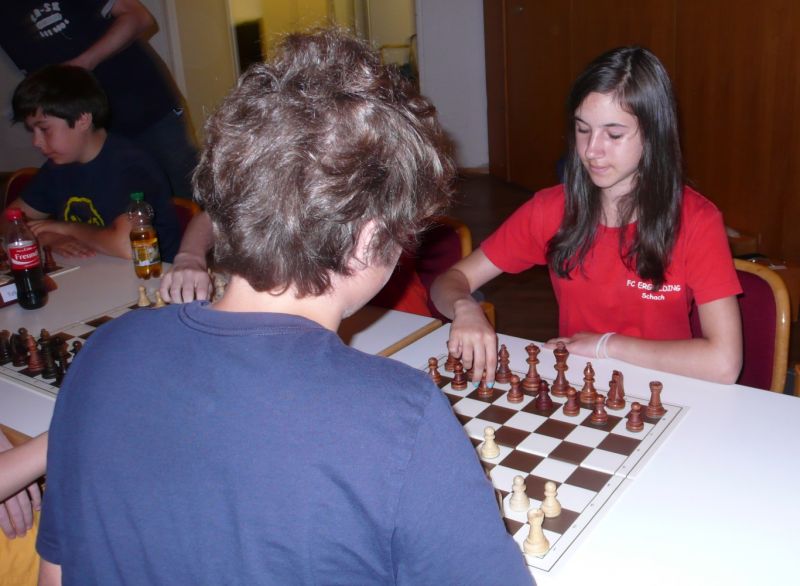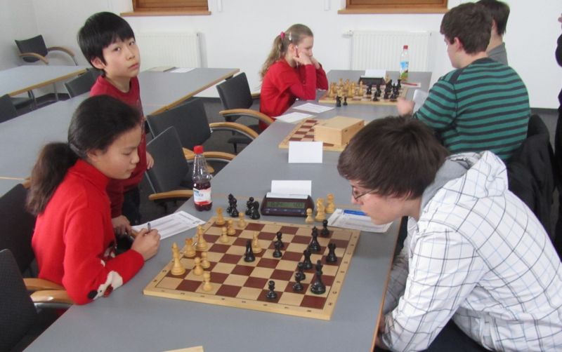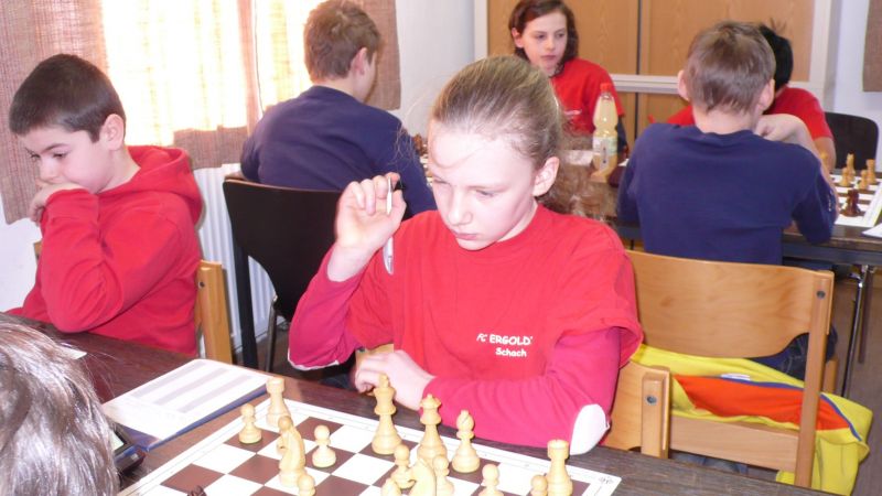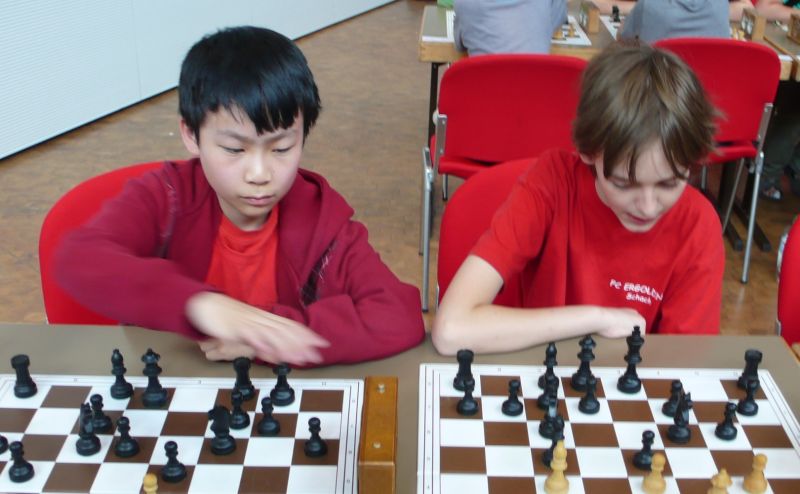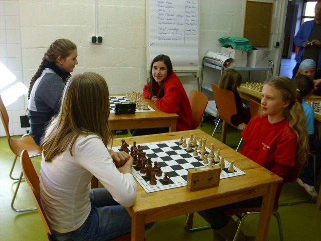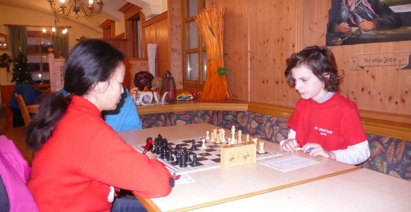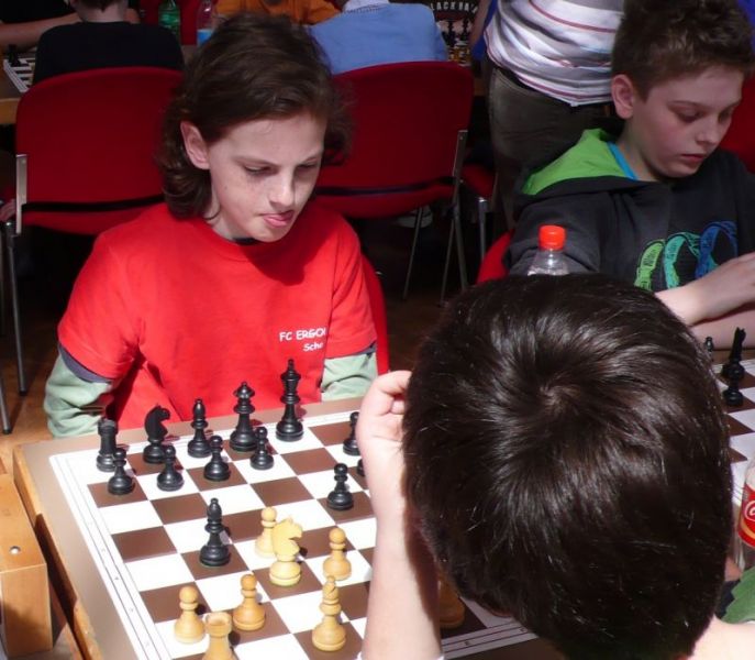 Doch etwas kurios, dass unsere Vierte gegen die Dritte die Oberhand behielt, aber in diesem Bereich entscheidet natürlich die Tagesform. Dass Maria Kühne an Brett 1 gegen Sebastian Astner gewann, war eigentlich keine Überraschung. Nach einer etwas unglücklich gewählten Eröffnung von Sebastian eroberte Maria das Zentrum und gewann im 11. Zug eine Figur. Im 20. Zug war zwar diese zurückgewonnen und ein Mehrbauer erzielt, aber ein brillanter Zug (für ein 9-jähriges Mädchen!) brachte Maria klare Vorteile. Nach einem Verteidigungsfehler von Sebastian im 29. setzte Maria im 31. Zug nach 55 Minuten Matt. An Brett 2 gewann Lukas Stessun gegen Michelle Reif zunächst ebenfalls im 11. Zug eine Figur und nach 14 Zügen eine zweite, aber im 24. Zug übersah Michelle ein einzügiges Doppelschachmatt. Im 35. Zug war sie zu "fresssüchtig". Nachdem sie bereits die Dame von Lukas erbeutet hatte, wollte sie sich auch noch den letzten Turm schnappen, übersah aber dabei, dass Lukas nun ein Bäuerlein durchbrachte. Damit lag Lukas wieder mit einem Läufer im Vorteil. Nach 62 Zügen und 1:03 Std. hatte Lukas glücklich gewonnen. Auch Anni Zhang und Clemens Ottmair lieferten an Brett 3 eine sehr spannende Partie ab. Im 10. Zug stellte Anni eine Figur ein, das gleiche passierte Clemens im 24. Zug. Im 26. Zug schenkte Anni erneut einen Figur her, und Clemens schien dem Sieg zuzusteuern. Aber im 30. ein einziger falscher Königszug kostete Clemens die Partie nach 34 Zügen und 1:35 Std. Dramatik an Brett 4: Jakob Klein übersah im 25. Zug eine Läufergabel des 7-jährigen "Ersatzmanns" Felix Handschuh und verlor dadurch einen Springer und stellte kurz darauf noch einen Turm ein. Aber dann gingen Felix über 30 Züge lang die Ideen aus und es folgte ein eher planloses Hin- und Hergeschiebe, bevor er im 71. Zug die Damen tauschen und nach 89 Zügen Matt setzen konnte.