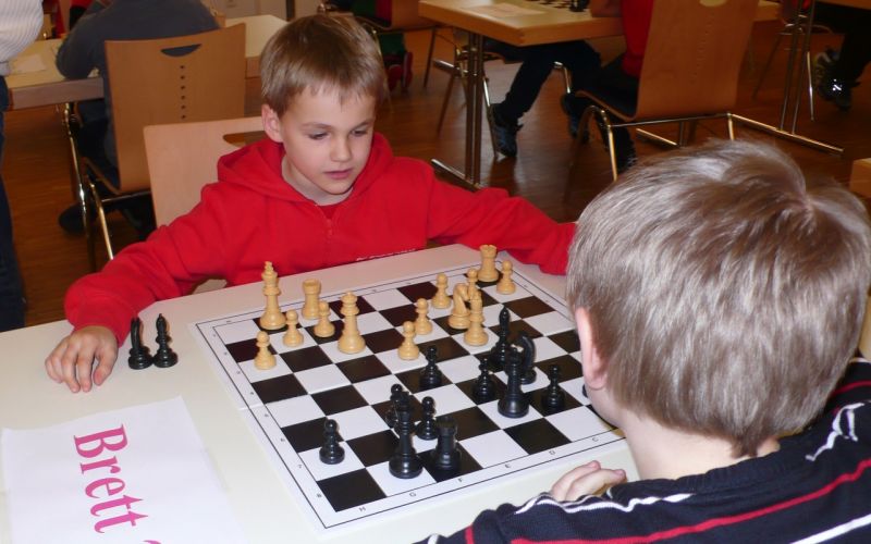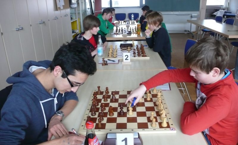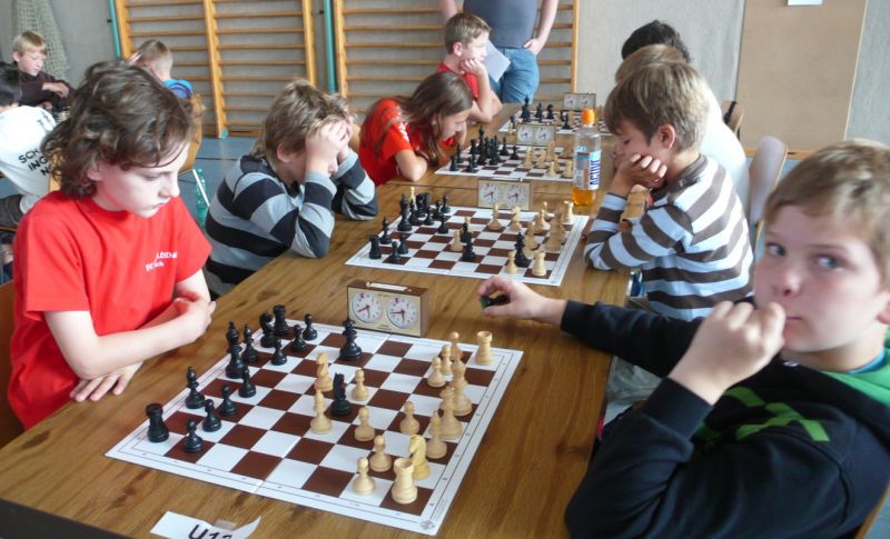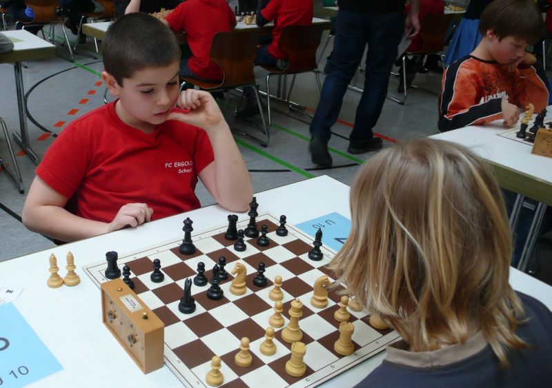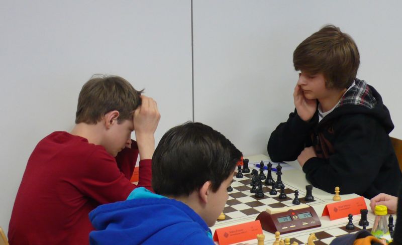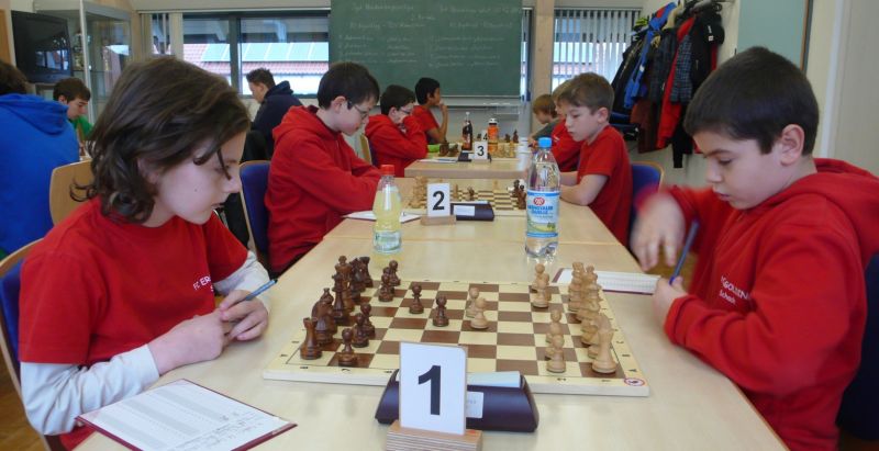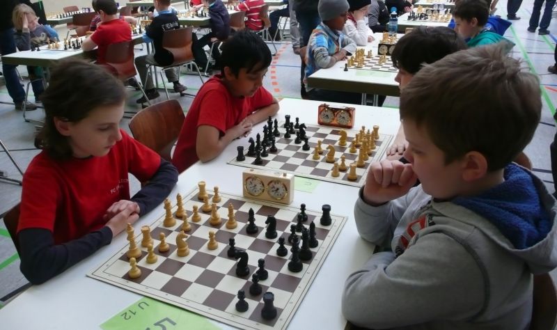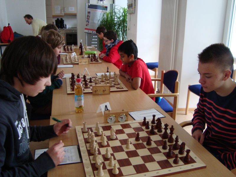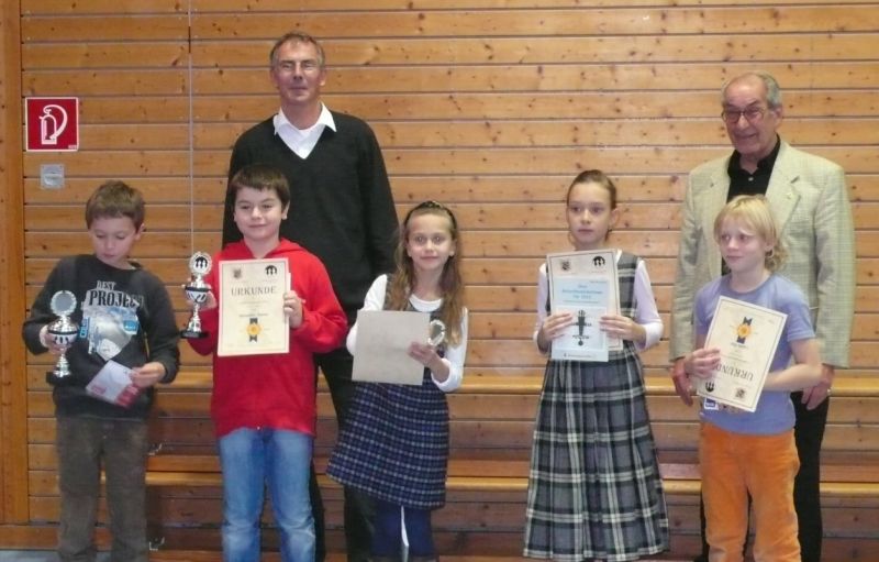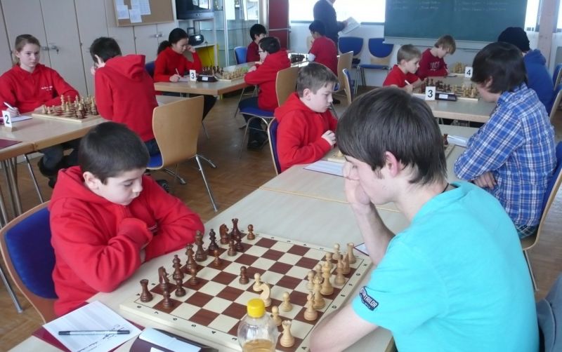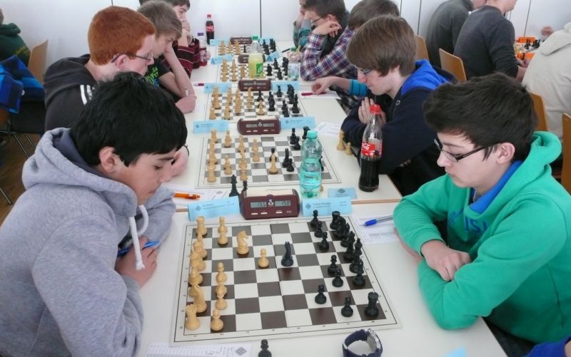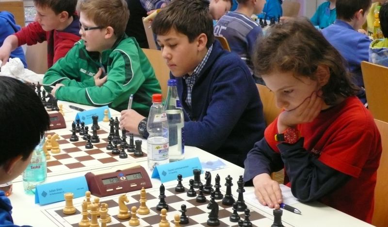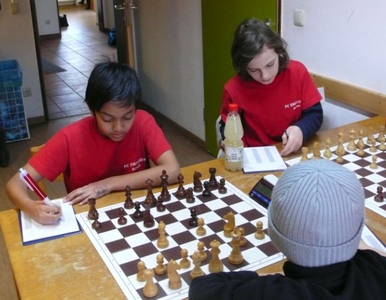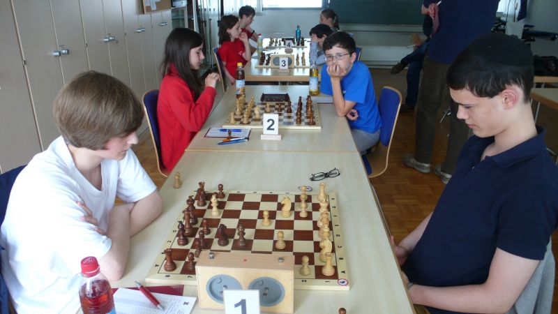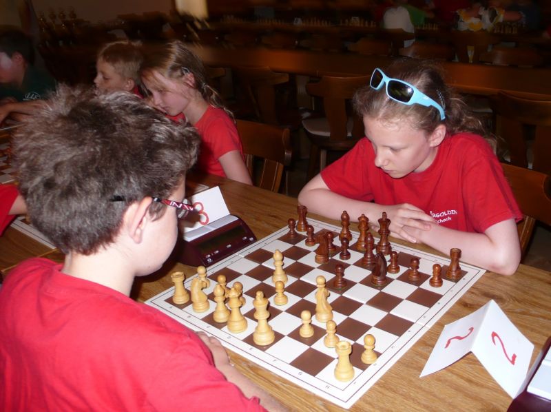 Doch etwas kurios, dass unsere Vierte gegen die Dritte die Oberhand behielt, aber in diesem Bereich entscheidet natürlich die Tagesform. Dass Maria Kühne an Brett 1 gegen Sebastian Astner gewann, war eigentlich keine Überraschung. Nach einer etwas unglücklich gewählten Eröffnung von Sebastian eroberte Maria das Zentrum und gewann im 11. Zug eine Figur. Im 20. Zug war zwar diese zurückgewonnen und ein Mehrbauer erzielt, aber ein brillanter Zug (für ein 9-jähriges Mädchen!) brachte Maria klare Vorteile. Nach einem Verteidigungsfehler von Sebastian im 29. setzte Maria im 31. Zug nach 55 Minuten Matt. An Brett 2 gewann Lukas Stessun gegen Michelle Reif zunächst ebenfalls im 11. Zug eine Figur und nach 14 Zügen eine zweite, aber im 24. Zug übersah Michelle ein einzügiges Doppelschachmatt. Im 35. Zug war sie zu "fresssüchtig". Nachdem sie bereits die Dame von Lukas erbeutet hatte, wollte sie sich auch noch den letzten Turm schnappen, übersah aber dabei, dass Lukas nun ein Bäuerlein durchbrachte. Damit lag Lukas wieder mit einem Läufer im Vorteil. Nach 62 Zügen und 1:03 Std. hatte Lukas glücklich gewonnen. Auch Anni Zhang und Clemens Ottmair lieferten an Brett 3 eine sehr spannende Partie ab. Im 10. Zug stellte Anni eine Figur ein, das gleiche passierte Clemens im 24. Zug. Im 26. Zug schenkte Anni erneut einen Figur her, und Clemens schien dem Sieg zuzusteuern. Aber im 30. ein einziger falscher Königszug kostete Clemens die Partie nach 34 Zügen und 1:35 Std. Dramatik an Brett 4: Jakob Klein übersah im 25. Zug eine Läufergabel des 7-jährigen "Ersatzmanns" Felix Handschuh und verlor dadurch einen Springer und stellte kurz darauf noch einen Turm ein. Aber dann gingen Felix über 30 Züge lang die Ideen aus und es folgte ein eher planloses Hin- und Hergeschiebe, bevor er im 71. Zug die Damen tauschen und nach 89 Zügen Matt setzen konnte.