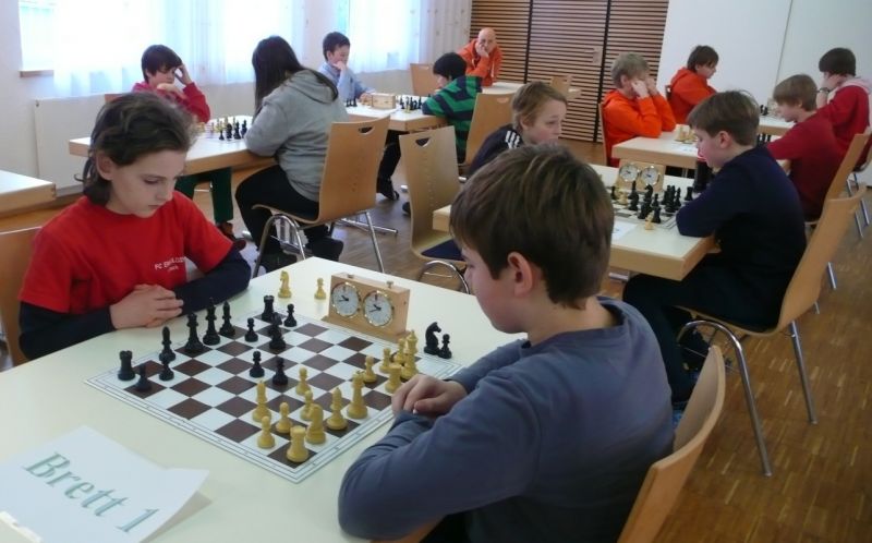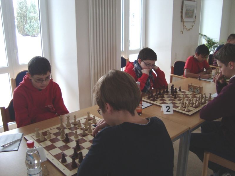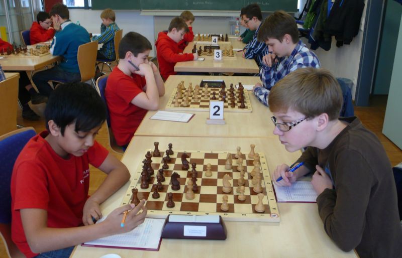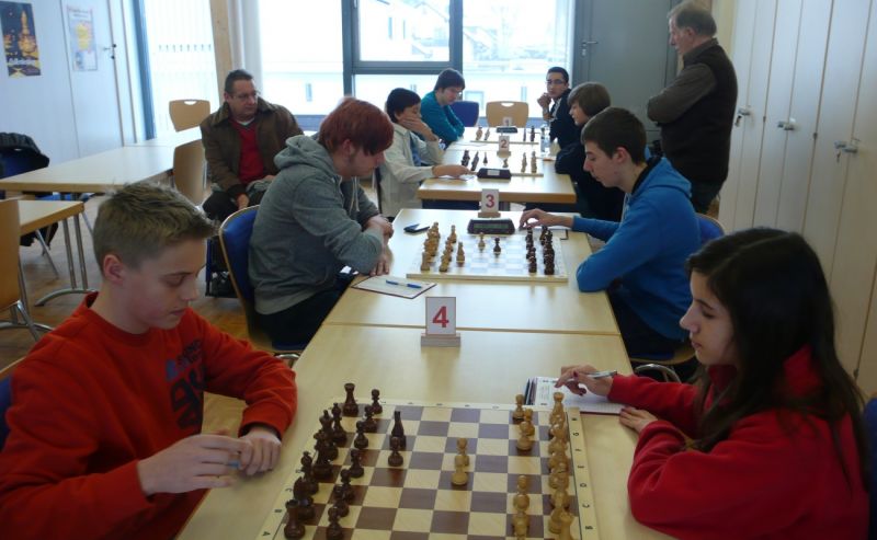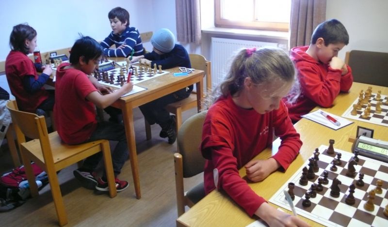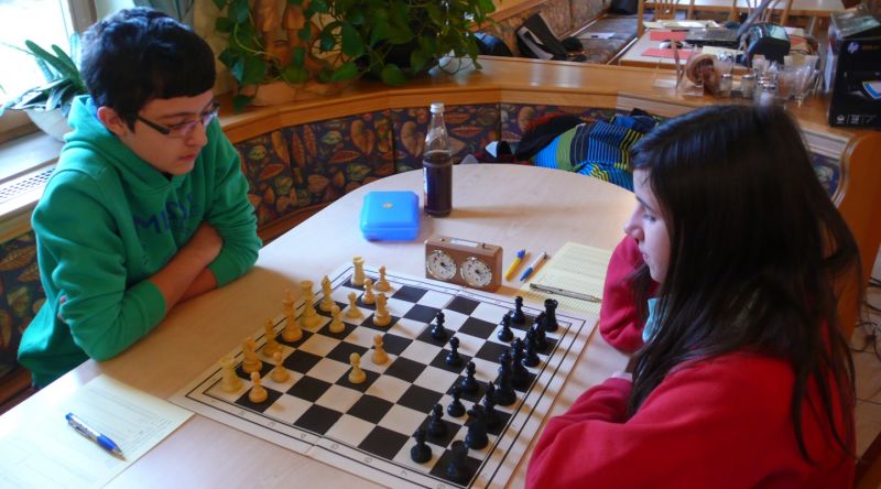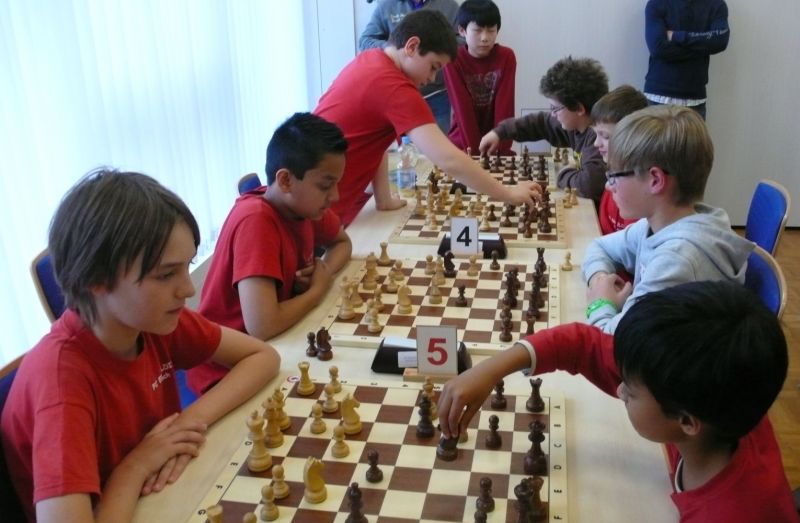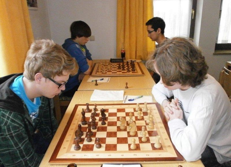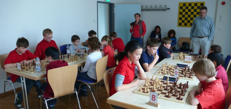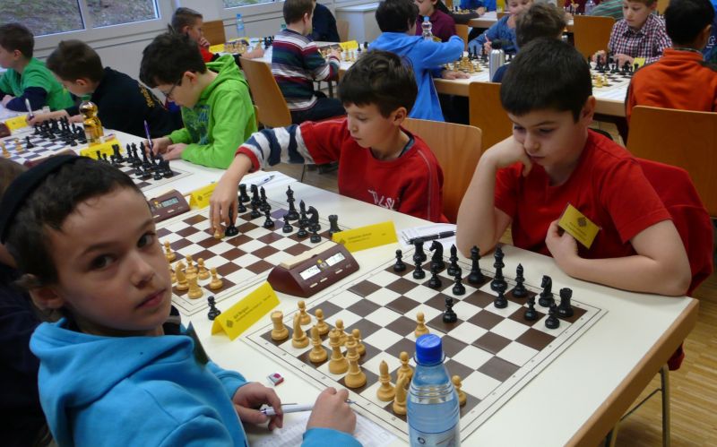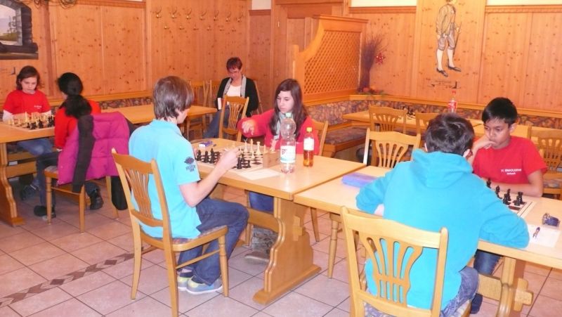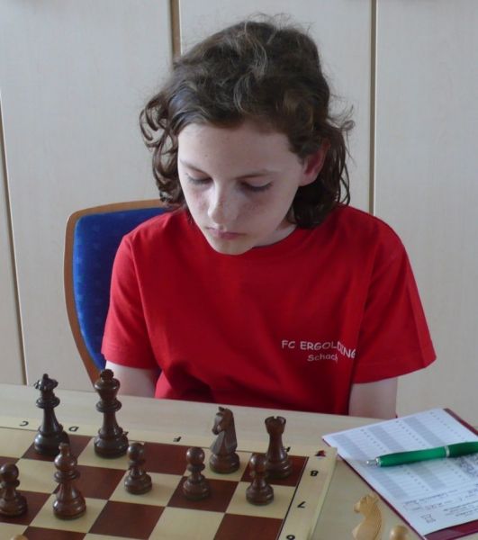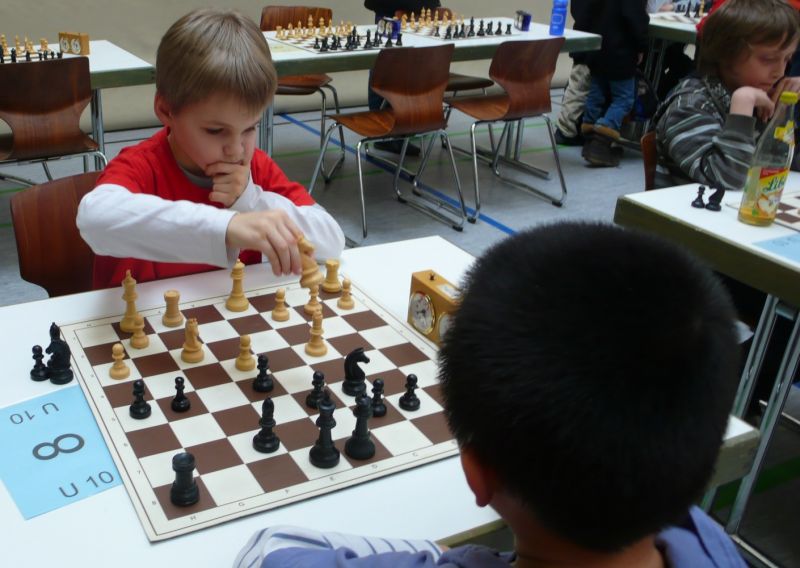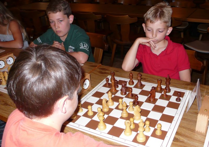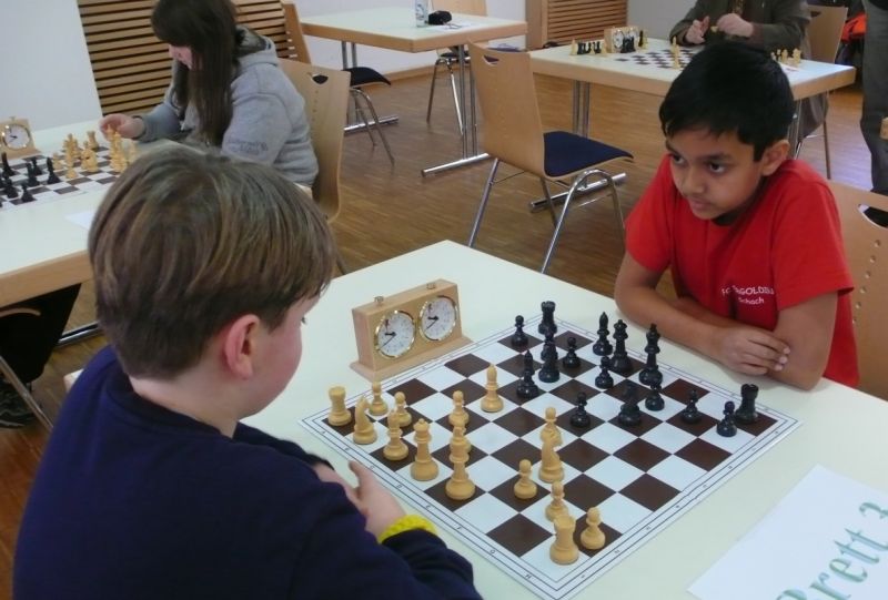 Doch etwas kurios, dass unsere Vierte gegen die Dritte die Oberhand behielt, aber in diesem Bereich entscheidet natürlich die Tagesform. Dass Maria Kühne an Brett 1 gegen Sebastian Astner gewann, war eigentlich keine Überraschung. Nach einer etwas unglücklich gewählten Eröffnung von Sebastian eroberte Maria das Zentrum und gewann im 11. Zug eine Figur. Im 20. Zug war zwar diese zurückgewonnen und ein Mehrbauer erzielt, aber ein brillanter Zug (für ein 9-jähriges Mädchen!) brachte Maria klare Vorteile. Nach einem Verteidigungsfehler von Sebastian im 29. setzte Maria im 31. Zug nach 55 Minuten Matt. An Brett 2 gewann Lukas Stessun gegen Michelle Reif zunächst ebenfalls im 11. Zug eine Figur und nach 14 Zügen eine zweite, aber im 24. Zug übersah Michelle ein einzügiges Doppelschachmatt. Im 35. Zug war sie zu "fresssüchtig". Nachdem sie bereits die Dame von Lukas erbeutet hatte, wollte sie sich auch noch den letzten Turm schnappen, übersah aber dabei, dass Lukas nun ein Bäuerlein durchbrachte. Damit lag Lukas wieder mit einem Läufer im Vorteil. Nach 62 Zügen und 1:03 Std. hatte Lukas glücklich gewonnen. Auch Anni Zhang und Clemens Ottmair lieferten an Brett 3 eine sehr spannende Partie ab. Im 10. Zug stellte Anni eine Figur ein, das gleiche passierte Clemens im 24. Zug. Im 26. Zug schenkte Anni erneut einen Figur her, und Clemens schien dem Sieg zuzusteuern. Aber im 30. ein einziger falscher Königszug kostete Clemens die Partie nach 34 Zügen und 1:35 Std. Dramatik an Brett 4: Jakob Klein übersah im 25. Zug eine Läufergabel des 7-jährigen "Ersatzmanns" Felix Handschuh und verlor dadurch einen Springer und stellte kurz darauf noch einen Turm ein. Aber dann gingen Felix über 30 Züge lang die Ideen aus und es folgte ein eher planloses Hin- und Hergeschiebe, bevor er im 71. Zug die Damen tauschen und nach 89 Zügen Matt setzen konnte.