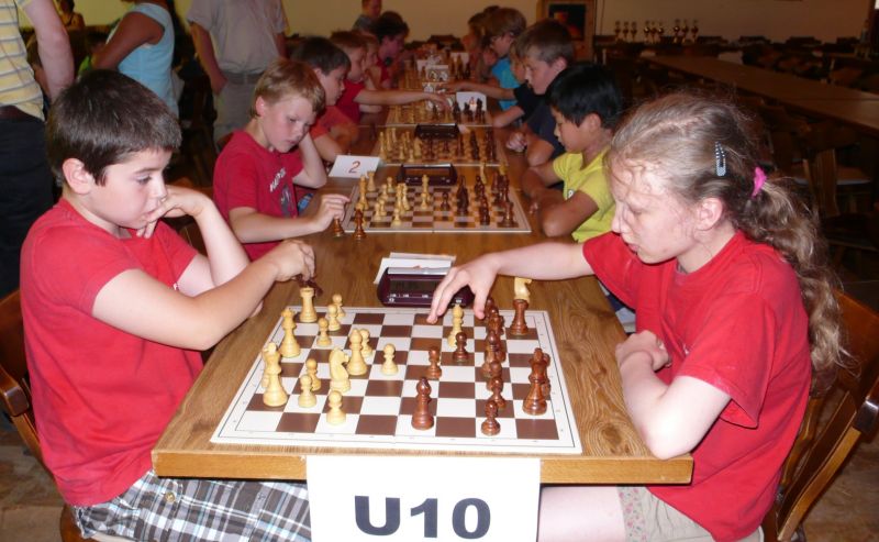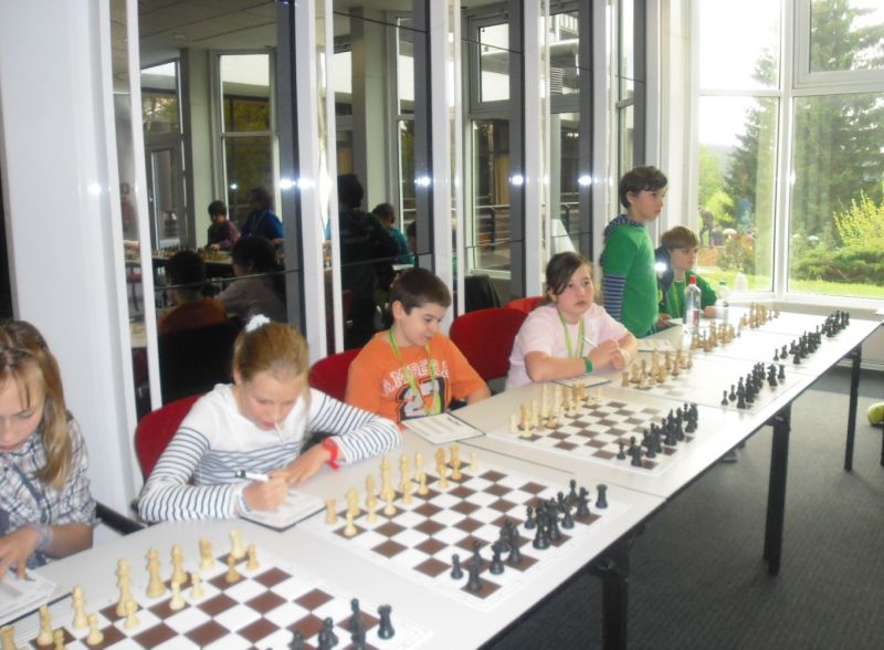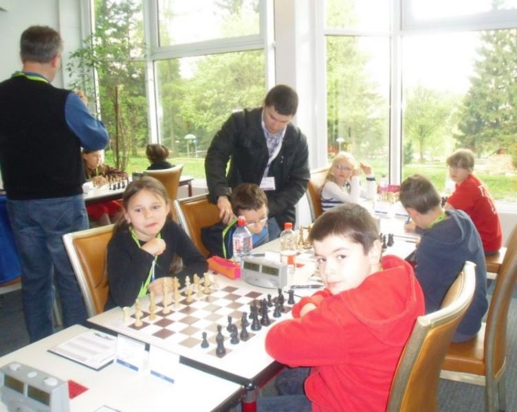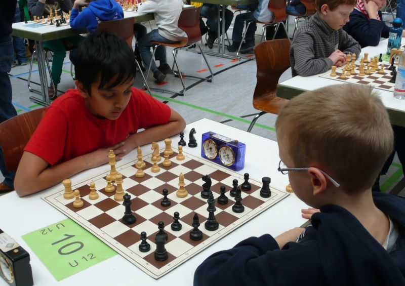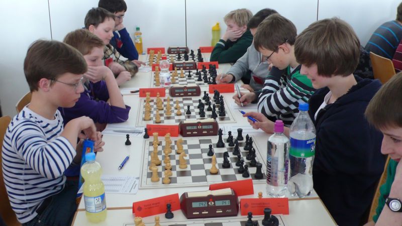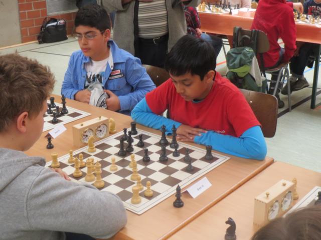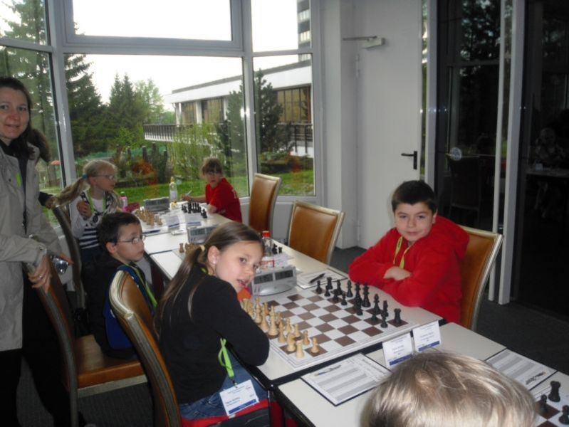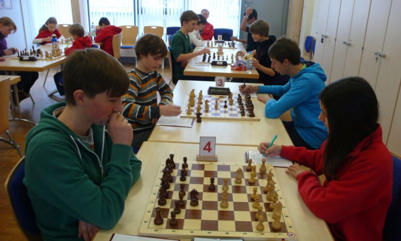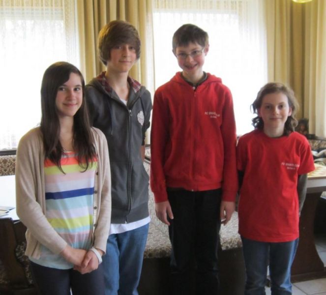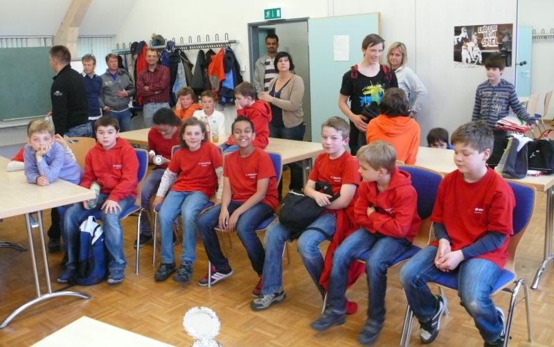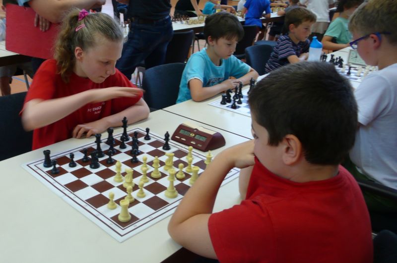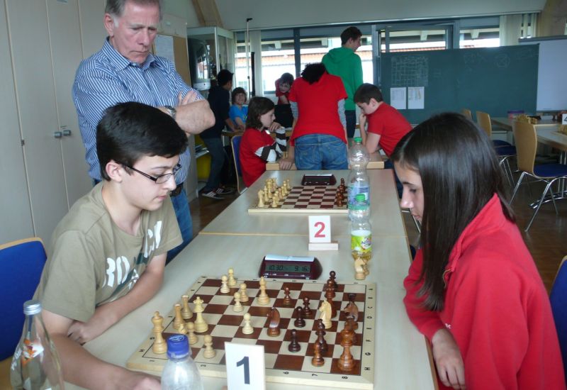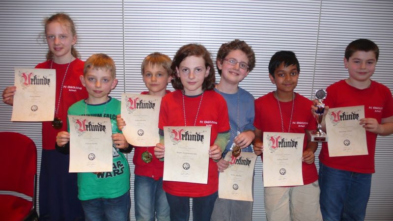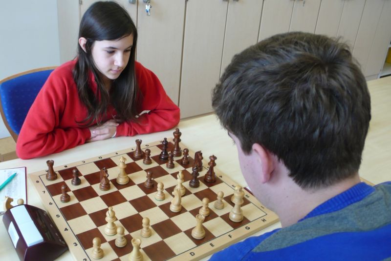 Doch etwas kurios, dass unsere Vierte gegen die Dritte die Oberhand behielt, aber in diesem Bereich entscheidet natürlich die Tagesform. Dass Maria Kühne an Brett 1 gegen Sebastian Astner gewann, war eigentlich keine Überraschung. Nach einer etwas unglücklich gewählten Eröffnung von Sebastian eroberte Maria das Zentrum und gewann im 11. Zug eine Figur. Im 20. Zug war zwar diese zurückgewonnen und ein Mehrbauer erzielt, aber ein brillanter Zug (für ein 9-jähriges Mädchen!) brachte Maria klare Vorteile. Nach einem Verteidigungsfehler von Sebastian im 29. setzte Maria im 31. Zug nach 55 Minuten Matt. An Brett 2 gewann Lukas Stessun gegen Michelle Reif zunächst ebenfalls im 11. Zug eine Figur und nach 14 Zügen eine zweite, aber im 24. Zug übersah Michelle ein einzügiges Doppelschachmatt. Im 35. Zug war sie zu "fresssüchtig". Nachdem sie bereits die Dame von Lukas erbeutet hatte, wollte sie sich auch noch den letzten Turm schnappen, übersah aber dabei, dass Lukas nun ein Bäuerlein durchbrachte. Damit lag Lukas wieder mit einem Läufer im Vorteil. Nach 62 Zügen und 1:03 Std. hatte Lukas glücklich gewonnen. Auch Anni Zhang und Clemens Ottmair lieferten an Brett 3 eine sehr spannende Partie ab. Im 10. Zug stellte Anni eine Figur ein, das gleiche passierte Clemens im 24. Zug. Im 26. Zug schenkte Anni erneut einen Figur her, und Clemens schien dem Sieg zuzusteuern. Aber im 30. ein einziger falscher Königszug kostete Clemens die Partie nach 34 Zügen und 1:35 Std. Dramatik an Brett 4: Jakob Klein übersah im 25. Zug eine Läufergabel des 7-jährigen "Ersatzmanns" Felix Handschuh und verlor dadurch einen Springer und stellte kurz darauf noch einen Turm ein. Aber dann gingen Felix über 30 Züge lang die Ideen aus und es folgte ein eher planloses Hin- und Hergeschiebe, bevor er im 71. Zug die Damen tauschen und nach 89 Zügen Matt setzen konnte.
