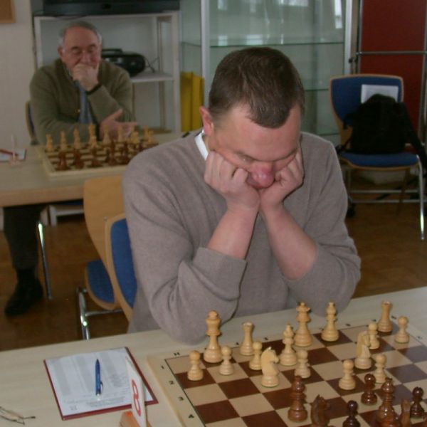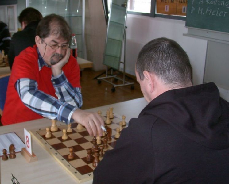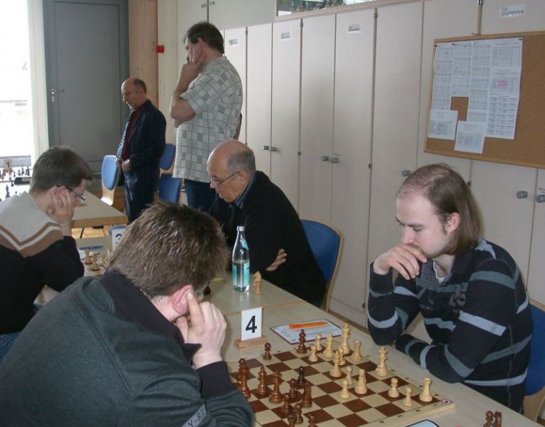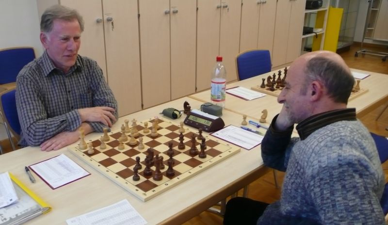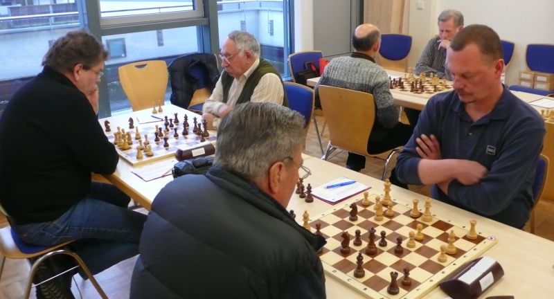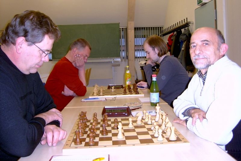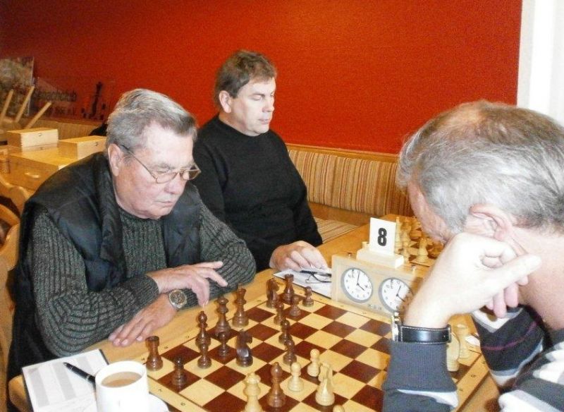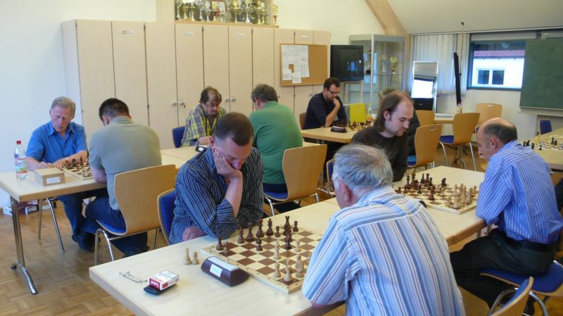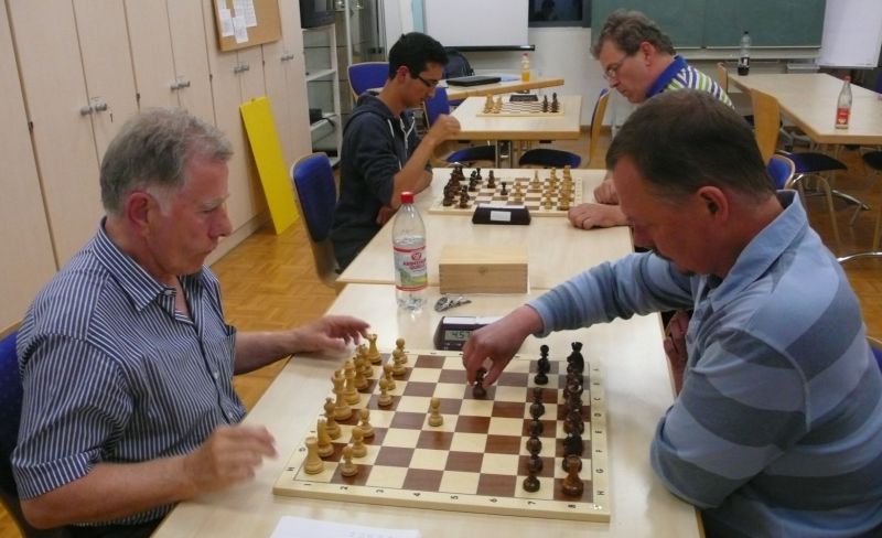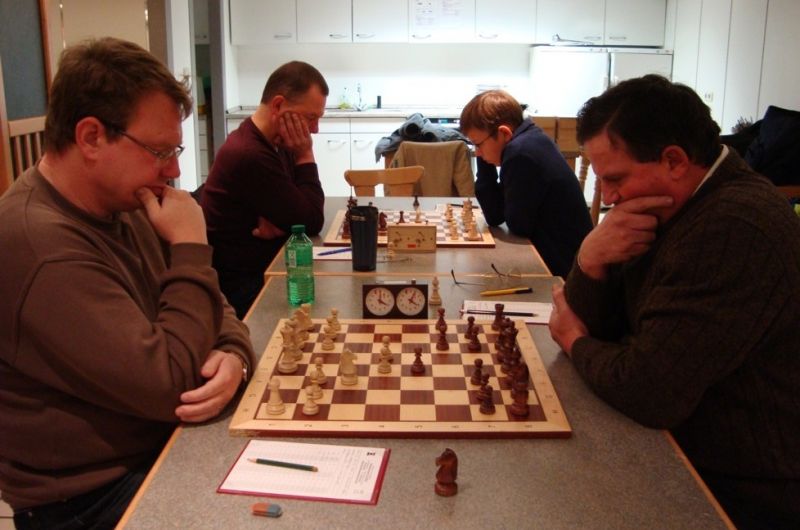 Günter Zorn - Tobias Denk 0:1, Caro-Kann/Abt.Var., 10 Züge, rd. 20 Min., Günter übersah im 10. Zug Bauernverlust mit anschließendem Figurenverlust, somit sofortige Aufgabe. Anton Königl - Ronald Kühne 0:1, Schottische Gamb., 50 Züge, 4:16 Std., erstes unerwartetes Ergebnis der Meisterschaft. Anton versäumte im 6. Zug anstatt b4 mit Db3 fortzusetzen und Schwarz wäre verlustig in der Gegend rumgestanden. So brachte ein Läuferopfer in der Eröffnung für zwei Bauern im Endspiel Turm gegen zwei Springer incl. zwei Freibauern, Sieg für Ronald. Borys Bilyavskyy - Vladimir Simin 0:1, Englisch, 57 Züge, 4:26 Std., Borys als Titelverteidiger konnte diese Partie trotz zäher Gegenwehr auf Dauer nicht im Gleichgewicht halten, Vladimir wurde seiner Favoritenrolle gerecht. Er spielte voll auf Angriff und wurde mit Qualitätsgewinn belohnt, der Rest zum vollen Punktgewinn war dann nur noch Routine. Nachholpartie Anton Kosinoga - Martin Meier 1:0, angen.Damengambit, 32 Züge, 1:30 Std. Ein ganz lockerer voller Punktgewinn für Anton. Martin verlor statt Figurentausch, vermeidbar im 15. Zug einen Springer, im 19. Zug als weiteres Geschenk die Quali. Als dann im 32. Zug der Verlust seines letzten Turmes drohte, beendete er das ungleiche Duell. ak