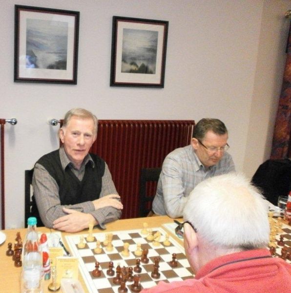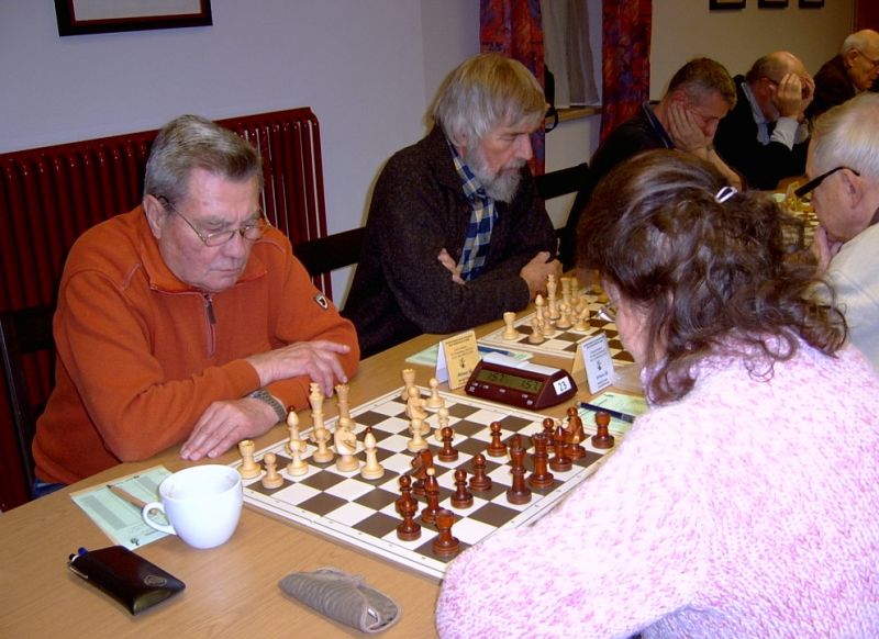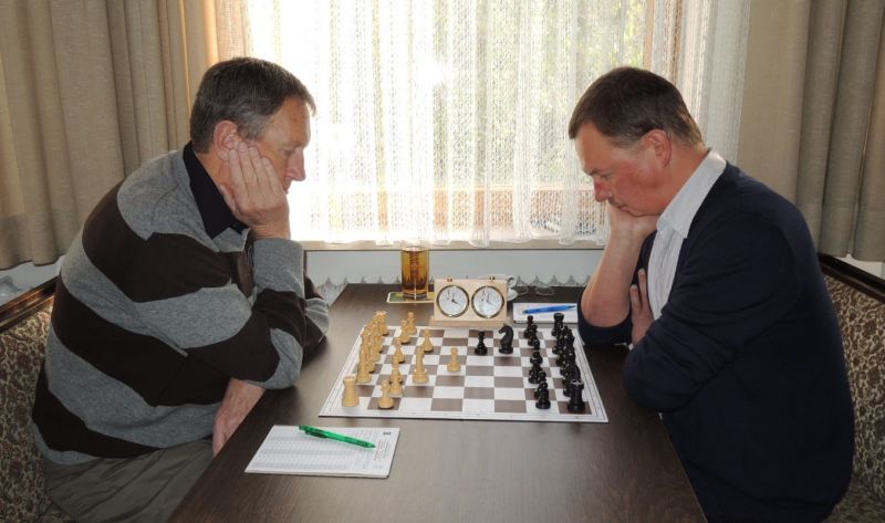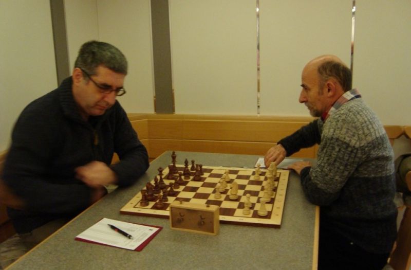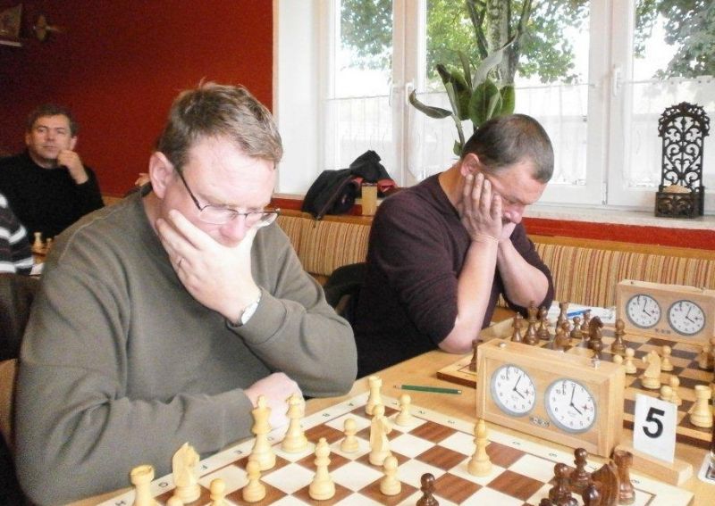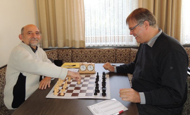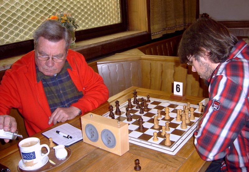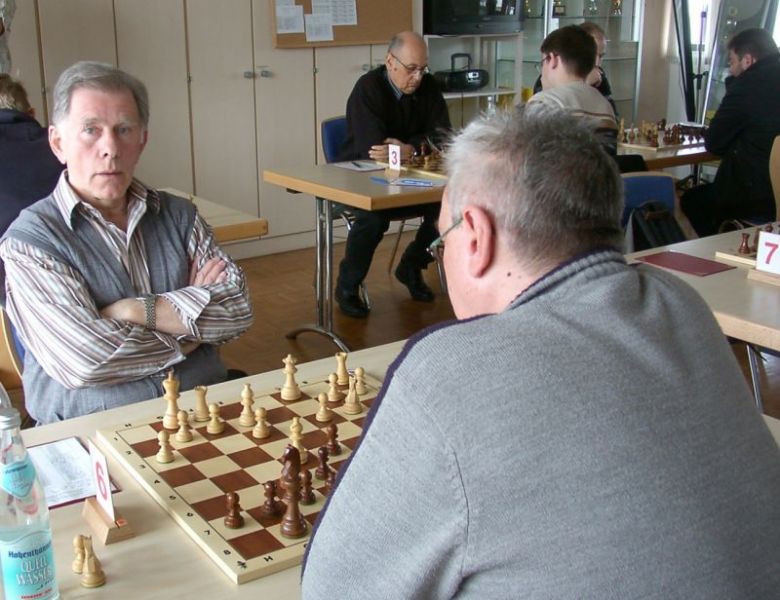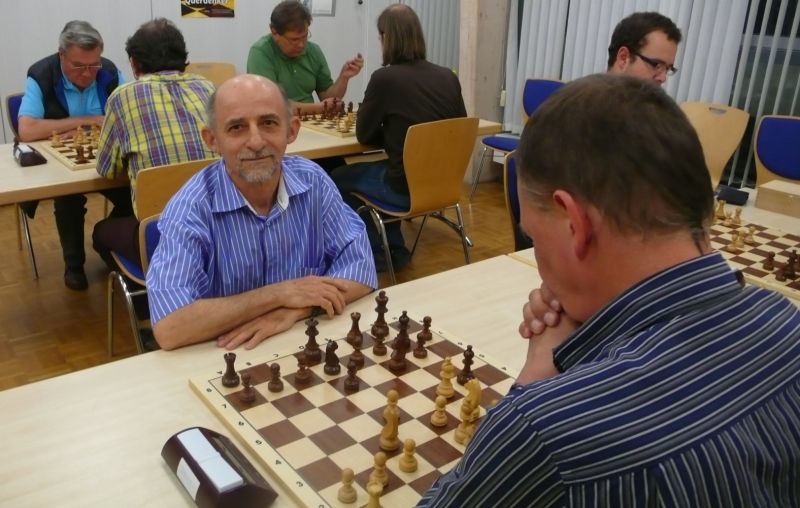 Günter Zorn - Tobias Denk 0:1, Caro-Kann/Abt.Var., 10 Züge, rd. 20 Min., Günter übersah im 10. Zug Bauernverlust mit anschließendem Figurenverlust, somit sofortige Aufgabe. Anton Königl - Ronald Kühne 0:1, Schottische Gamb., 50 Züge, 4:16 Std., erstes unerwartetes Ergebnis der Meisterschaft. Anton versäumte im 6. Zug anstatt b4 mit Db3 fortzusetzen und Schwarz wäre verlustig in der Gegend rumgestanden. So brachte ein Läuferopfer in der Eröffnung für zwei Bauern im Endspiel Turm gegen zwei Springer incl. zwei Freibauern, Sieg für Ronald. Borys Bilyavskyy - Vladimir Simin 0:1, Englisch, 57 Züge, 4:26 Std., Borys als Titelverteidiger konnte diese Partie trotz zäher Gegenwehr auf Dauer nicht im Gleichgewicht halten, Vladimir wurde seiner Favoritenrolle gerecht. Er spielte voll auf Angriff und wurde mit Qualitätsgewinn belohnt, der Rest zum vollen Punktgewinn war dann nur noch Routine. Nachholpartie Anton Kosinoga - Martin Meier 1:0, angen.Damengambit, 32 Züge, 1:30 Std. Ein ganz lockerer voller Punktgewinn für Anton. Martin verlor statt Figurentausch, vermeidbar im 15. Zug einen Springer, im 19. Zug als weiteres Geschenk die Quali. Als dann im 32. Zug der Verlust seines letzten Turmes drohte, beendete er das ungleiche Duell. ak