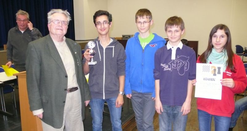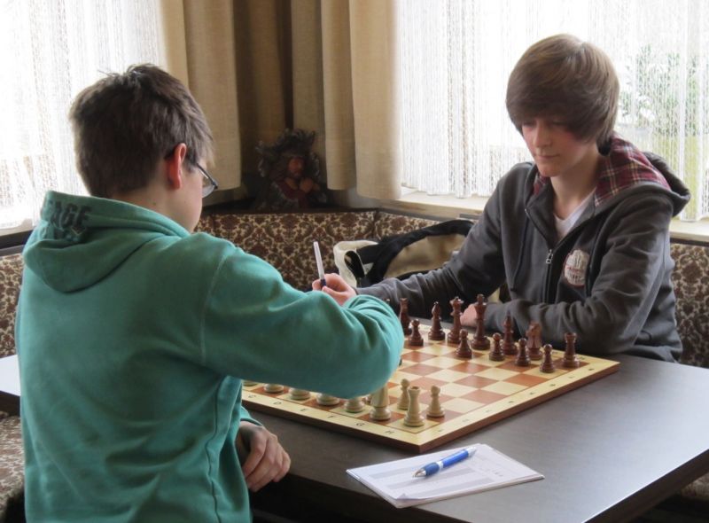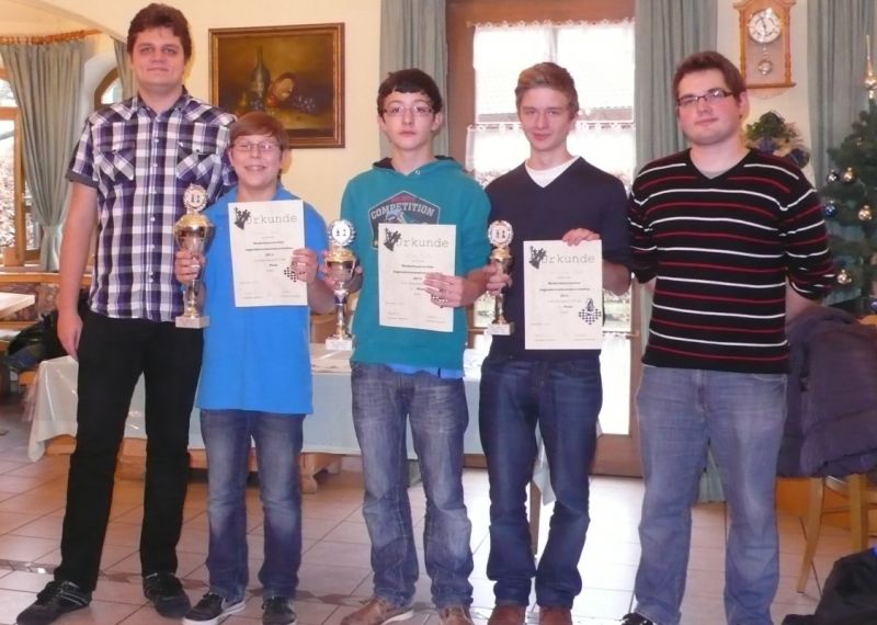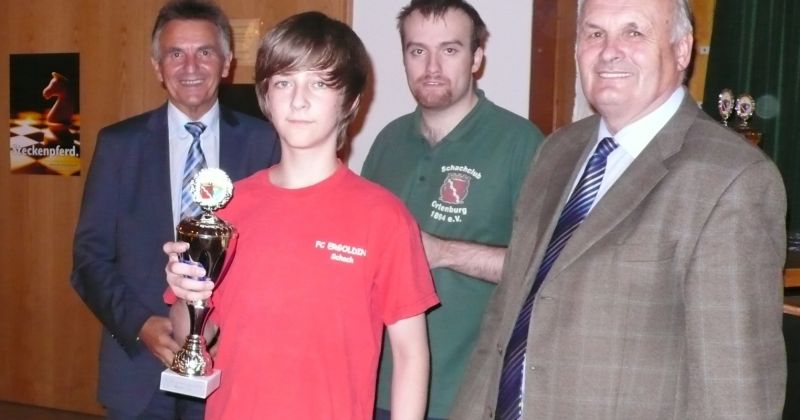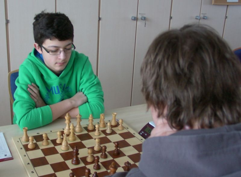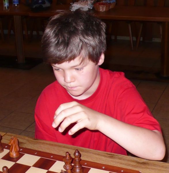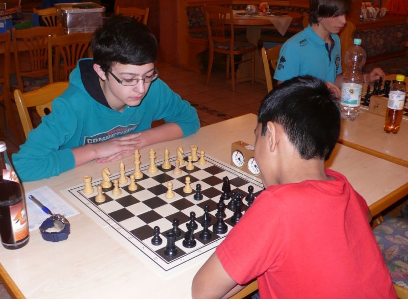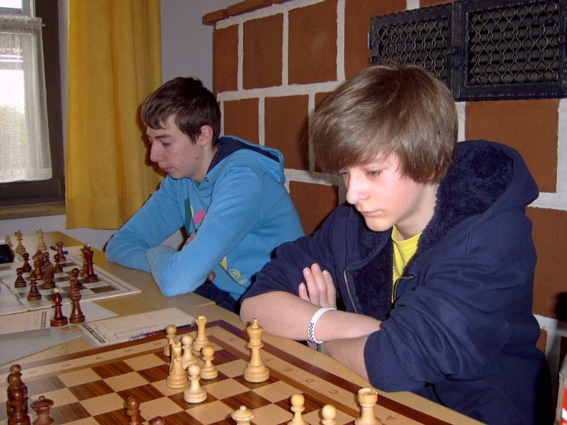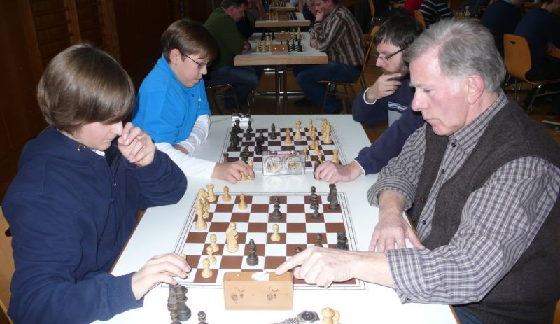 Der noch 12-jährige Henrik Fesl (1416) hatte in der ersten Runde natürlich gegen den Lokalmatador Uwe Kleibel (2088 DWZ) keine Chance. Er hielt zwar recht wacker mit und lag bis zum 14. Zug in etwa gleichauf. Dann aber spielte Uwe seine Routine aus und gewann im 32. Zug die Qualität. Sein Turm war schließlich im Endspiel Henriks Springer klar überlegen und nach 45 Zügen und 1:57 Stunden war das Match für den Ortenburger sicher gewonnen. Henrik spielte diese erste Partie noch viel zu schnell, er verbrauchte für die 45 Züge nur 38 Minuten, was sich aber im Verlauf des Turnier bessern sollte. In der zweiten Runde war Henrik eigentlich Favorit gegen Christoph Auer (SC Ortenburg, 1156). Er holte sich im 14. Zug einen von Christoph "vergessenen" Bauer ab und versuchte diesen kleinen Vorsprung mit Abtäuschen bis ins Bauernendspiel zu behaupten, was ihm auch gelang. Leider versäumte er ab dem 38. einige Gewinnzüge und musste nach 59 Zügen und 2:24 Std. ins Remis einwilligen. In der dritten Partie war der DWZ-lose Winfried Bartsch der Gegner. Henrik hatte etwas mehr vom Spiel, aber nach 41 Zügen und 2:42 Std. einigte man sich in ausgeglichener Stellung wohl zurecht aufs Remis. Am letzten Tag lief Henrik dann zur Hochform auf und schaffte noch zwei Siege. Zuerst gegen Dr. Michael Schäfer (SF Gotteszell, 1187), als er im 23. Zug wieder einen ungedeckten Bauer schlagen konnte. Wieder tauschte er alles ab, aber diesmal konnte er seinen Mehrbauer durch Zugzwang gewinnbringend nach 53 Zügen in 2:24 Std. zum Sieg verwerten. Henrik blieb seinem Stil auch in der letzte Partie gegen Rüdiger Bartsch treu. Im 29. Zug gewann er, diesmal durch eine Fesselung, einen Bauer. Dann tappte der Ortenburger in eine Mattfalle am Königsflügel und nach 52 Zügen und 3:19 Std. war das Match siegreich beendet. Mit ebenfalls 3 Punkten wurde Henrik 20.igster, mit ebenso vielen Punkten wie Ronny und auch genauso viel Buchholz und auch in der Drittwertung waren die beiden gleich. Vermutlich hat der Computer aber die drei Siege von Ronny, gegenüber den zwei Siegen und zwei Remis von Henrik den Vorrang gegeben. In der inoffiziellen DWZ-Auswertung gewann Henrik 17 Punkte hinzu und steht jetzt somit auf 1433. Bei der Siegerehrung erhielt Henrik den U14-Pokal und Ronny als zweitbester den U18-Pokal, weil Manuel Albrecht (SK Landau-Dingolfing) als bester Spieler der U1600 ausgezeichnet wurde.