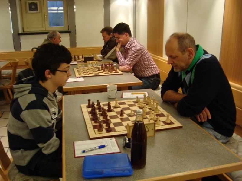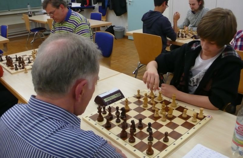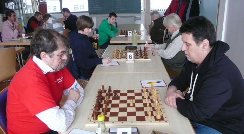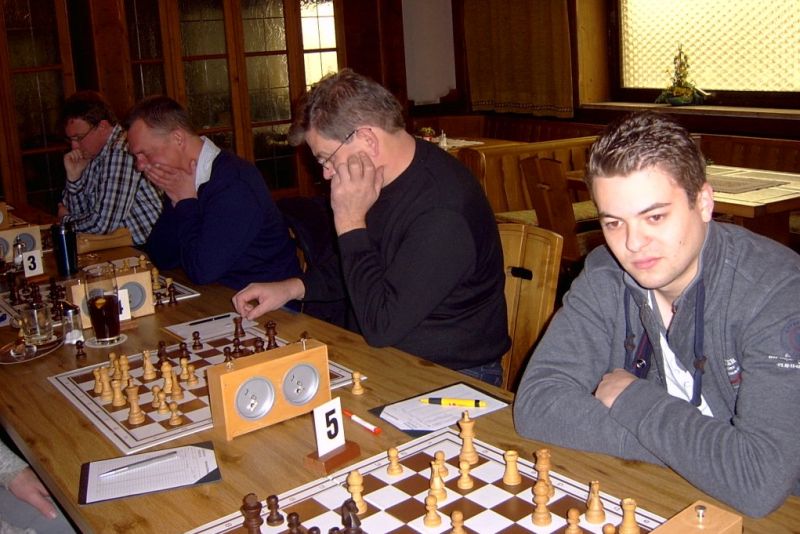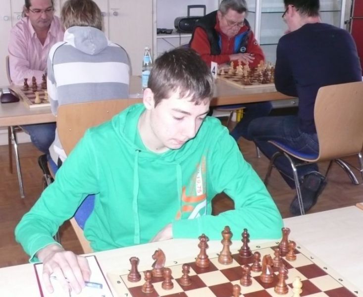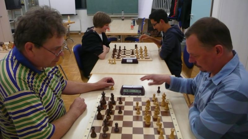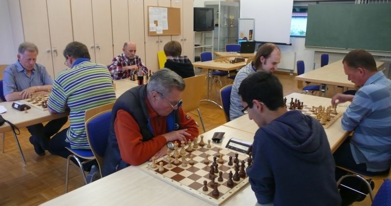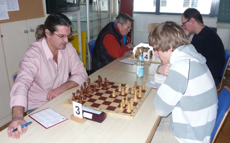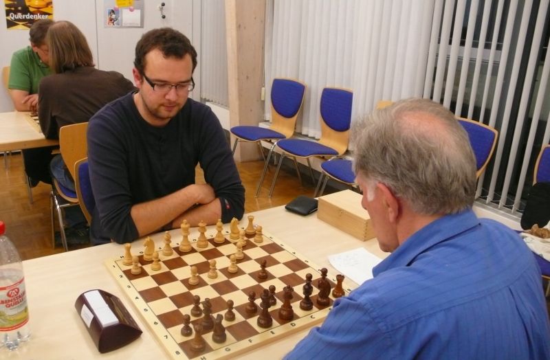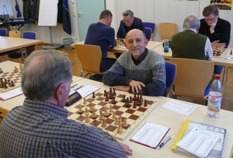 Das erste positive Ergebnis meldete Waldemar Golder (Brett 3). Sein Sizilianer brachte ziemlich früh Figurengewinn, somit ein lockerer Punktgewinn zu Beginn der Runde. Am Spitzenbrett servierte Vladimir Simin einen Königsinder, nach einigem Eröffnungsgeplänkel wurde die Friedenspfeife geraucht d.h. friedliche Punkteteilung. Bei Paul Gehann (6) stand ein geschlossener Sizilianer auf dem Programm. Um seine eingeschlossene Dame zu retten, musste sein Brettnachbar einen Läufer opfern und das war natürlich der Anfang vom Ende. Tobias Schoepe (2) wurde ein Sizilianer vorgesetzt, mit diesmal großer Spielfreude offerierte er im Finale seinem Gegenüber ein undeckbares Matt mit Punktverlust. Auch Tobias Laimer (5) begeisterte als Nachziehender alle Mitspieler mit seinem Damengambit. Doppelter Figurengewinn schon in der Eröffnungsphase und im Mittelspiel ließen seinen verzweifelten Kontrahenten die weiße Fahne hissen, der Mannschaftssieg war bereits nach fünf Partien entschieden. Die einzige verschmerzbare Niederlage musste Tobias Denk (7) einstecken. Seine gewählte Caro-Kann Verteidigung löste einen zielstrebigen und sehenswerten Königsangriff seinen Gegners aus, Turmverlust und ein nicht zu parierendes Matt waren die Folge. Dieter Wist (8) war trotz häuslicher Müdigkeit am Brett hellwach, eroberte beim Sizilianer seines Mitstreiters die Qualität und letztendlich vollen Punktgewinn. Als Letzter quälte sich Borys Bilyavskyy (4) mühsam ins Ziel. Das angenommene Damengambit des Rottalers stellte ihn vor einige Probleme, mit Mühe konnte er doch noch ein Remis ergattern.