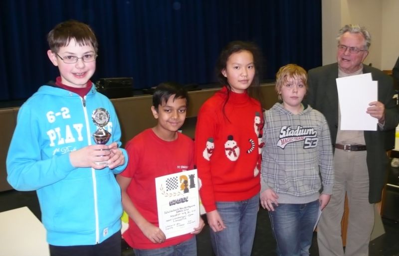 Maria Kühne (FCE, 772) war als 17. mit 9 Punkten zweitbestes Mädchen, knapp vor Anni Zhang (FCE, 9 Punkte). Es waren auch zwei U8-Spieler im Einsatz, bester war Yannick Hamo (FCE) auf Rang 21, der sogar schon zwei Siege einheimsen konnte. Kurz vor 15°° wurde planmäßig die Siegerehrung durchgeführt, bei der die ersten Drei und das beste Mädchen mit Pokalen und die Klassenbesten mit Urkunden ausgezeichnet wurden. Schade dass diese Meisterschaften nicht von mehr Vereinen besucht werden.