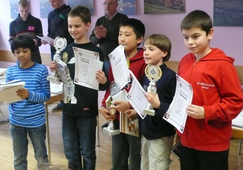 Bester war diesmal Henrik Fesl (1451), der bei seinem letzten U14-Turnier Claudio Longo vom SC Germering (1486) mit dem hauchdünnen Vorsprung von einem halben Buchholzpunkt auf den 2. Platz verwies. Beide blieben ungeschlagen und verbuchten neben 5 Siegen noch 2 Remis. Eine erfreuliche Überraschung unsererseits bei der U12: Hinter den beiden haushohen Favoriten Marcel Daoud (SC Freising, 1655) und Josef Sebastian Ott (SG Traunstein/Traunreuth, 1599) belegte der noch DWZ-lose Clemens Ottmair sensationell den 3. Platz und erhielt dafür seinen ersten Schachpokal. Clemens hatte in der letzten Runde gegen Florian Feicht (SC Tegernsee, 1384) noch ein paar Sekunden mehr auf der Uhr, also ein glücklicher Sieg, aber Ehre wem Ehre gebührt! Er verlor nur in der 1. Runde gegen den Ergolding-Sieger Max Gilhuber (SK Töging, 1080) und gegen Ott. Auch nicht schlecht Aditya Tarade (950), der gegen Yaroslav Yaroshenko (SK Gräfelfing, 1340) gegen Feicht verlor, und in der letzten Runde noch gegen Daoud den Kürzeren zog. Aber auch sein 9. Rang unter den 23 Teilnehmern war völlig ok. Bei der U10 hatten wir ein starkes Trio am Start. Sebastian Astner (1028) kämpfte in der letzen Runde nach 4 Siegen und 2 Remis noch um den 2. Platz. Aber er verlor gegen Thomas Loreth (Oberndorf/AUSTRIA, 1049) und wurde damit auf den 3. Rang hinter Massimo Longo (SC Germering, 1155) und Maximilian Lohr (TSV Mainburg, 1060) verwiesen. Mit Startnummer 7 ein durchaus achtbares Ergebnis, genau wie der 5. Rang von Maria Kühne (1000), die nur gegen Longo und Astner verlor, aber mit Abstand das beste Mädchen war. Auch der 11. Rang von Neuling Patrick Sowka kann sich durchaus sehen lassen, wenngleich er momentan zuviele "gewonnene" Partien letztlich doch noch verschenkt. Nach dem großartigen 2. Platz beim Ergoldinger Jugendopen belegte Felix Handschuh diesmal bei der U8 in einem starken Feld den guten 4. Rang hinter Johannes Pachmann vom SC Ammersee, Simon Wagner vom PSV Dorfen (784) und Brian Gan (SK Kolbermoor, 768).