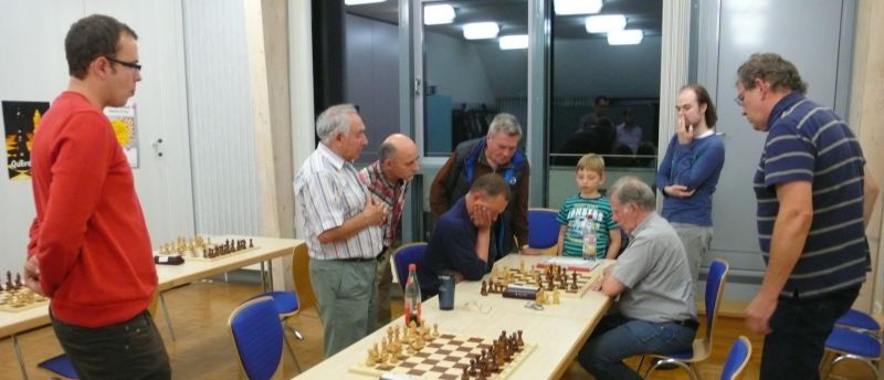 Am Freitag eröffnete Spielleiter Anton Königl die Vereinsmeisterschaften der neuen Saison. Insgesamt beteiligen sich diesmal leider nur acht Spieler, im Vorjahr waren es noch 10, weil da auch noch zwei Jugendspieler dabei waren, die diesmal leider keine Zeit haben. Borys Bilyavskyy - Günter Zorn 1:0, 47 Züge, 3:20 Std., Caro-Kann, Vorstoß-Variante. Günter behandelte die Eröffnung schon im 3. Zug nicht nach Theorie, trotzdem musste sich der Titelverteidiger lange durchquälen. Nach Qualivorteil und einigen Mehrbauern war der ganze Punkt in seinem Sack. Vladimir Simin - Anton Kosinoga 1:0, 30 Züge, 3:28 Std. Spanische Vert. Lange Zeit konnte Anton die Partie im Gleichgewicht halten. Am Königsflügel konnte Vladimir im Mittelspiel einen druckvollen Angriff starten, nach Verlust seines Läufers konnte der Schwarze auf der offenen g-Linie ein undeckbares Matt durch 2 Türme mit Dame nicht mehr verhindern. Ronald Kühne - Tobias Denk 0:1, 44 Züge. 4:08 Std. Grünfeld-Vert. Tobias musste viel Zeit investieren und sehr genau als Nachziehender spielen, um erfolgreich in das Vereinsturnier zu starten. Ronald hielt sich als Neuling in unserer Runde recht wacker, er spielte immerhin gegen den Meister von 2007/08. Nach dem Verlust von drei Bäuerlein bis ins Endspiel war seine Premiere vorbei. Martin Meier - Anton Königl 0:1, Martin machte schon in "seiner" Englischen Eröffnung etliche Fehler und stand nach 7 Zügen bereits klar auf Verlust. Nach 13 Zügen hätte Anton in zwei Zügen Matt setzen können, nach 21 Zügen und 58 Minuten war das ungleiche Match entschieden. ak