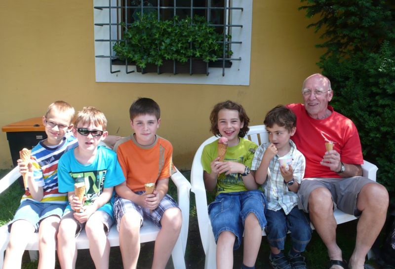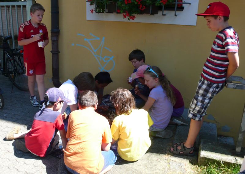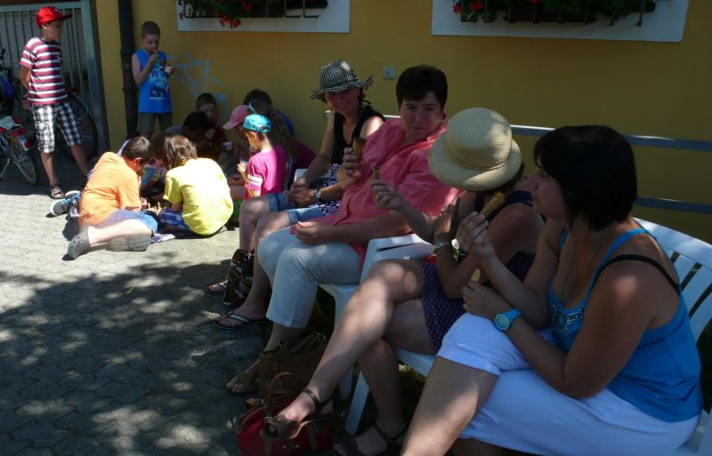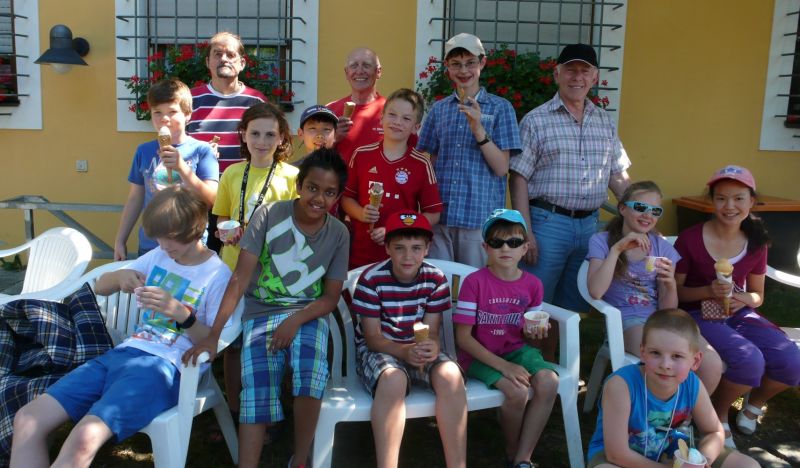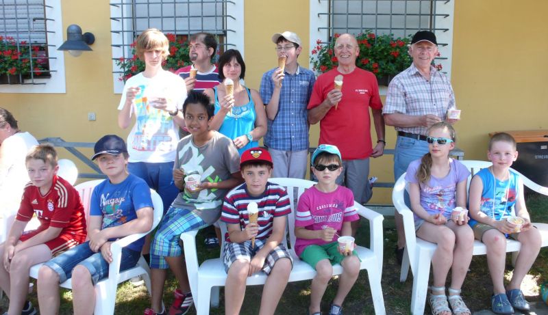 Traditionell fuhr Schachkursleiter Helmut Gmeinwieser mit den Kindern, die am häufigsten am letzten Schachkurs teilnahmen, mit den Fahrrädern in eine Landshuter Eisdiele.