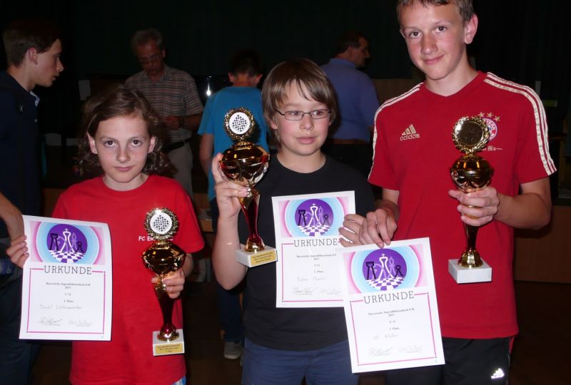 Eine vorzügliche Leistung vollbrachte Daniel Lichtmannecker, der im ersten Jahr der U12 an zehnter Stelle (eigentlich mit seiner aktuellen DWZ sogar nur an Rang 12) in der Startliste stand. Daniel lag schon bei Halbzeit nach 9 Siegen und einem Remis nur knapp hinter einem der Favoriten, Ruben Mantel (Spvg Zabo-Eintracht Nürnberg, 1681 DWZ), der alle 10 Spiele gewann. Daniel spielte auch am Nachmittag gut weiter und blieb bis zur vorletzten (17.) Runde mit 14 Siegen und drei Remis ungeschlagen auf Platz 2. In der 18. Runde folgte dann die einzige klare Niederlage gegen Ruben Mantel und die letzte Runde gegen den DWZ-Favorit und Bayerischen Vizemeister im Normalschach, Sebastian Reimann (SK Göggingen, 1733), war entscheidend um die Vergabe der Pokale: Bei einer Niederlage wäre Daniel leer ausgegangen und Vierter geworden, ein Remis hätte für Rang 3 gereicht und bei einem Sieg war sogar der Vizemeistertitel in Reichweite. Daniel wehrte einen starken Angriff knapp ab, gewann einen Bauer und hatte dann gutes Gegenspiel, das er gekonnt zum sicheren unerwarteten Sieg nützte. Nach dem 7. Platz bei den diesjährigen Bayerischen Langzeit-Meisterschaften war dies Daniels größter Erfolg in seiner noch jungen, erst zweijährigen, Schachkarriere! Für Sebastian Astner war es schon eine gute Sache, sich überhaupt bei den "Niederbayerischen" für diese Meisterschaften qualifiziert zu haben. Im Vorjahr gewann er noch bei den U8 einige Turniere und könnte somit noch weitere drei Jahre bei dieser U12-Meisterschaft teilnehmen. Er war mit 1028 DWZ als Nummer 16 gesetzt, konnte diesen Platz aber mit 5 Siegen nicht ganz halten und fiel auf Rang 18 zurück. Aber immerhin besiegte er Alexander Höhn (1407) und Christoph Pölt (1444), zwei Spieler, die deutlich mehr DWZ ausweisen. Von Daniel und Sebastian wird hoffentlich noch einiges zu hören sein.
