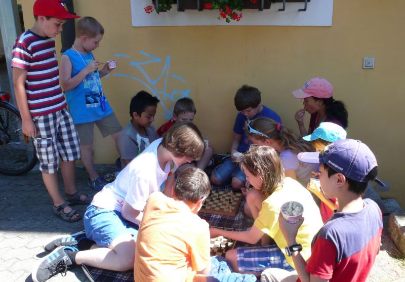 Das herrliche Sommerwetter mit ca. 30° im Schatten machte so richtig Lust aufs Eisessen. Es war wieder ein gelungenes Event der Ergoldinger Schachjugend, das durch die "Zehnerlkasse" und mit einer großzügigen Spende von Abteilungsleiter Eckert Dietl finanziert wurde. Jugendleiter Helmut Gmeinwieser fuhr mit Stellv. Abteilungsleiter Anton Königl und einigen Kindern mit den Fahrrädern vom Ergoldinger Bürgerhaus nach Landshut in die "Stamm-Eisdiele". Die Kinder und Jugendlichen, die in Landshut und Umgebung wohnen, kamen direkt zum Treffpunkt. Zwei Kinder hatten ihre Reiseschachbretter dabei und so kamen nicht nur die Gaumen - 58 Eiskugeln wurden geschleckt - nein, auch das beliebte Tandemspielen zum Einsatz. Eisessen und Schachspielen, was will man mehr?