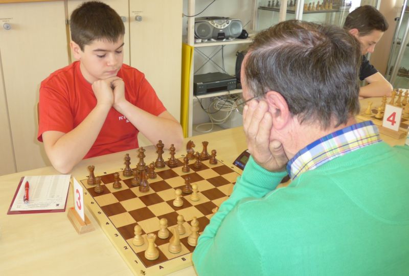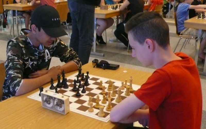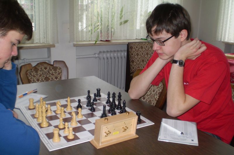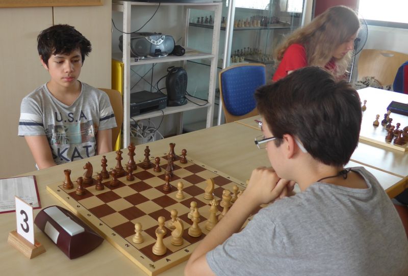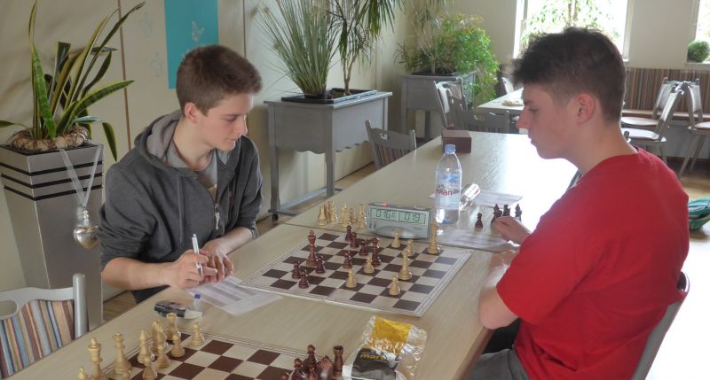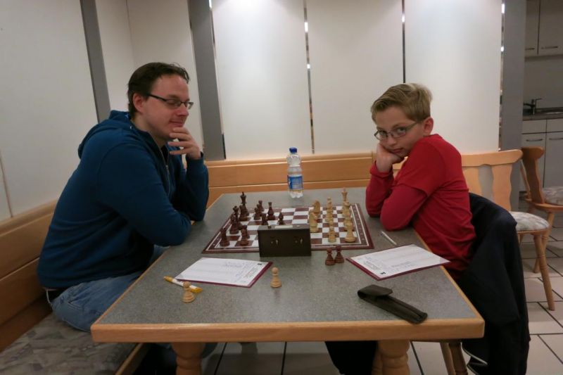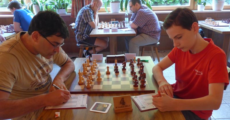 Dimitri Alexandrov - Gabriel Mock 1/2, Russische Eröffnung. Gabriel verlor schon in der Eröffnung nach acht Zügen einen Zentrumsbauern, wobei sein 5. Zug nicht der Theorie entsprach. Sein aktives Angriffsspiel brachte einiges an Risiko, Fritz zeigte bei beiden im Mittelspiel diverse male rot. Dimitri erzielte bis zum Endspiel ein gesundes Plus von zwei Mehrbauern. Das Lustige an der Geschichte, beiden blieben im Endspiel nur die zwei Randbauern übrig mit gleichzeitigem überraschendem Remis. Im 40. Zug hätte statt b4 ein g4 noch den Gewinn gebracht. Bei Bauernendspielen entscheidet oft nur ein Zug über die Punkteverteilung. Insgesamt waren es 49 Züge.