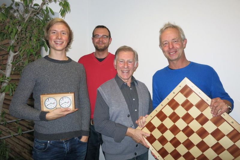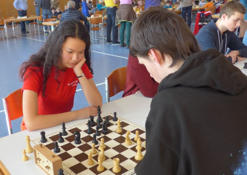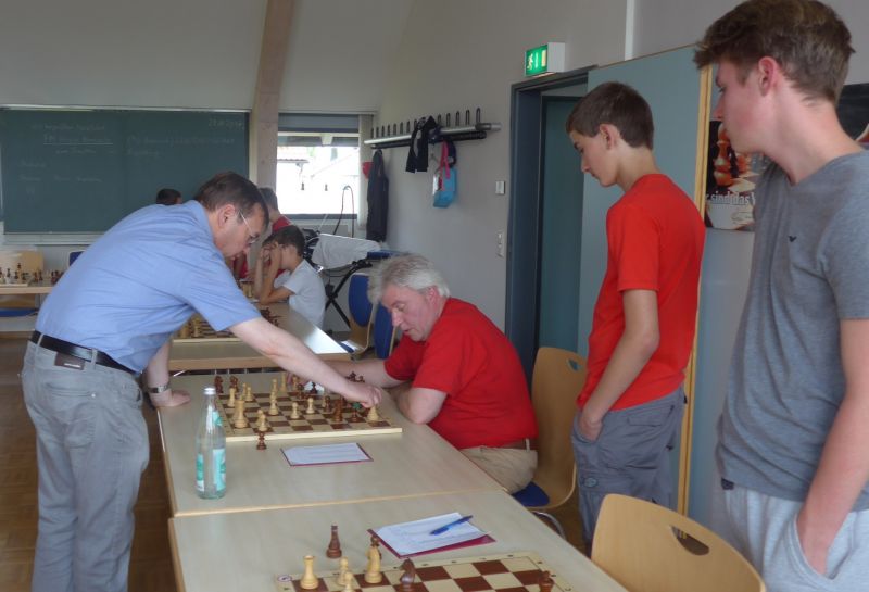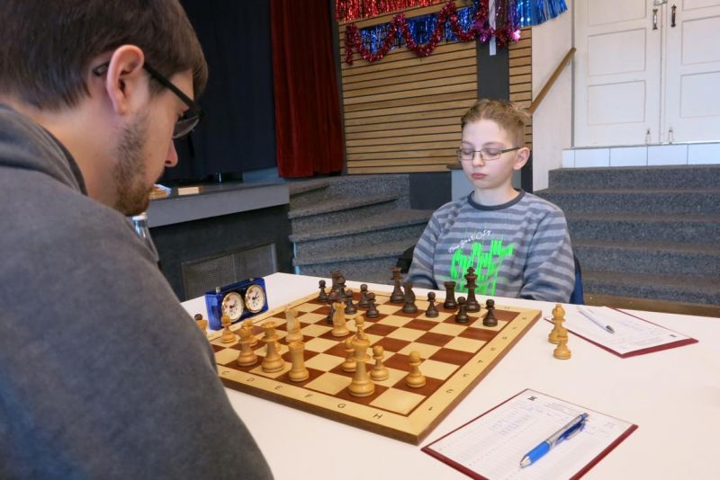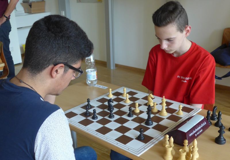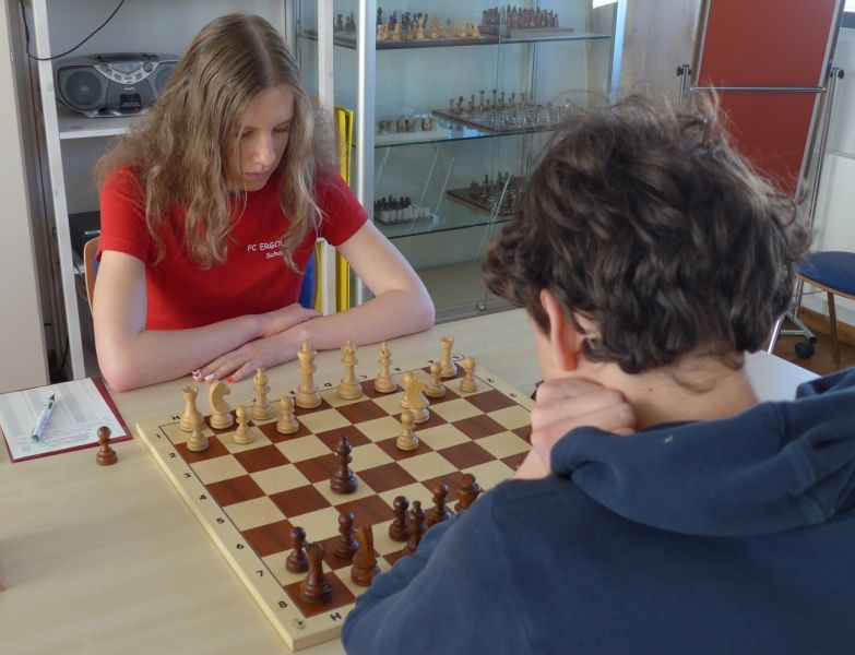 Eine kuriose Partie an Brett 4 zwischen den in die Vierte ausgerückten Tobias Hampel und Neuzugang Peter M. Ebrahimi. Zunächst gewann Peter eine Figur, dann verlor er seine Dame, am Ende hatte Peter wieder einen Turm mehr und gewann das Endspiel nach 1:23 Std. sicher zum 1:0. Kurz darauf gewann an Brett 1 Raphael Zwander nach 44 Zügen und 1:29 Std. gegen Simon Lichtinger (953). Simon gewann zwar die Quali, konnte aber dem vorgerückten Freibauernpaar von Raphael im Finale nichts nehr entgegensetzen. Die Überraschung an Brett 3, als Stefan Mundani (990) gegen den 8-jährigen Christopher Jessen eine Niederlage einstecken musste. Stefan hatte nach 29 Zügen einen Mehrbauer und sah wie der sichere Sieger aus. Nach einem Fehler hatte Christpher einen Bauer mehr und wie er dann im Finale mit nur einem Mehrbauer ein gekonntes Endspiel aufs Brett zauberte, war schon sehenswert. Nach 2:16 Std. und 77 Zügen stand es nur noch 2:1 für die Vierte. Im geschwisterlichen Duell zwischen Anni (1020) und Andy Zhang (860) war die Partie lange ausgeglichen, mit leichten Vorteilen für Andy. Erst ganz zuletzt setzte er seinen König auf ein Feld, auf dem der einziehende Bauer Annis Schach geben konnte, und das war die Entscheidung. Anni hatte nur noch 19 Sekunden auf der Uhr, als ihr im 57. Zug nach insgesamt 2:24 Std. der Mattzug gelang.