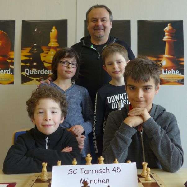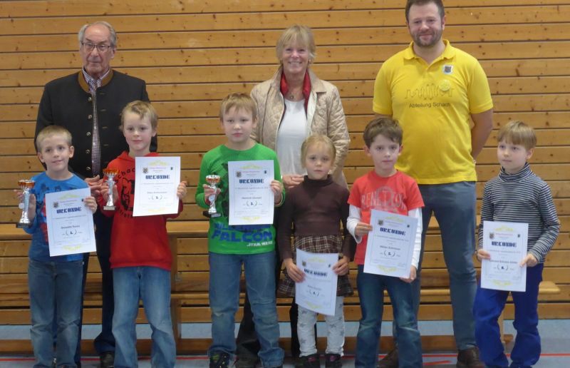 Unsere Mannschaften 6, 7 und 8 spielen eigentlich nur mit, um die Bezirksliga-West wenigstens auf sechs Mannschaften aufzustocken. Dass bei diesen kleinen noch ziemlich unerfahrenen Spielern, die teils noch nicht schreiben können, noch viele Fehler passieren, ist von vorn herein klar. Einige sind mit dem Schreiben mehr beschäftigt, als mit dem Nachdenken. So auch Felix Neubauer, der an Brett 1 gegen Viraj Tarade zwei Figuren einstellte und dann auch noch ein Matt in Eins übersah. Nach nur 16 Minuten und 19 Zügen 1:0 für die Sechste. Auch an Brett 3 hatte der um vier Jahre ältere Martin Vladimirov nicht viel Mühe gegen den erst 6-jährigen Niklar Schrinner. Auch hier nur 19 Minuten und 25 Züge, 2:0. Dann aber die große Überraschung an Brett 2, als der ebenfalls erst knapp 6-jährige Leopold Merli gleich seine erste Turnierpartie gegen den "alten Hasen" David Häglsperger, der schon seit fast zweu Jahren regelmäßig ins Training kommt, gewinnen konnte. David war nach 6 Zügen klar im Vorteil, aber Leopold konnte sich herausmogeln und im 17. Zug gelang ihm eine Springergabel mit Damengewinn. Drei Züge später gelang David das gleiche, Springergaben mit Damengewinn, alles wieder ausgeglichen! Im 33. Zug dann ein Figurengewinn von Leopold und im 36. Zug ein schönes Matt nach nur 24 Minuten. Nur noch 2:1 für die Sechste. Die Entscheidung fiel an Brett 4 zwischen Sena-Nur Sanli und Lennart Strehler. Sena-Nur gewann zwei Türme und einen Läufer und stellte dann im 26. Zug ihre Dame ein. Aber es reichte trotzdem, im 32. Zug nach auch nur 29 Minuten gelang ihr ein Grundreihenmatt zum 3:1-Sieg für die Sechste.