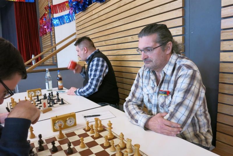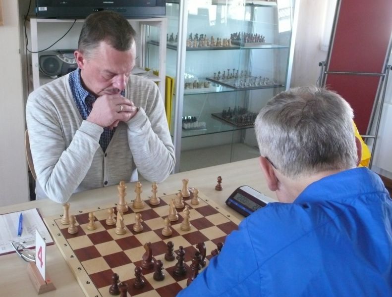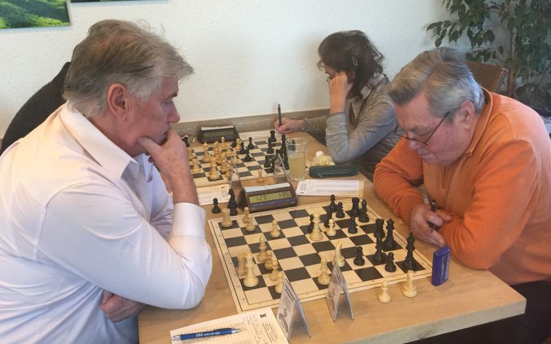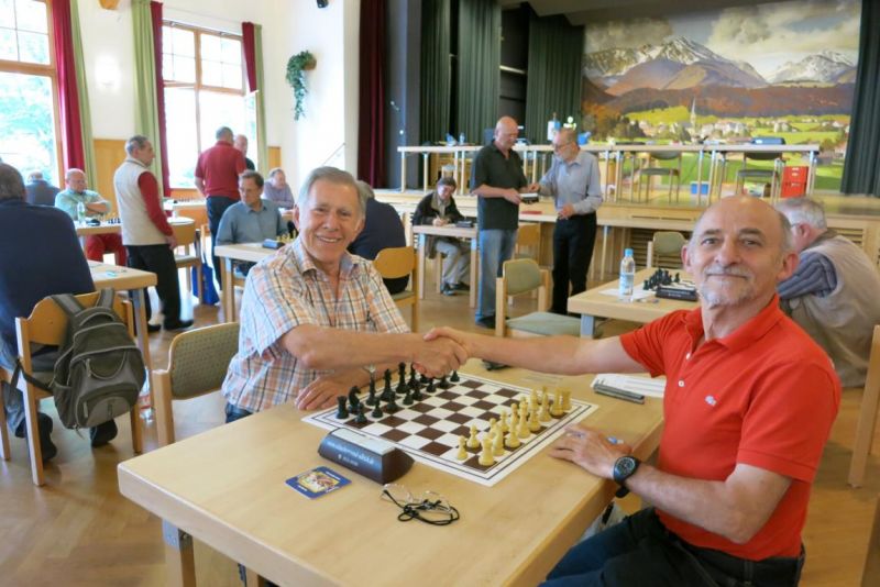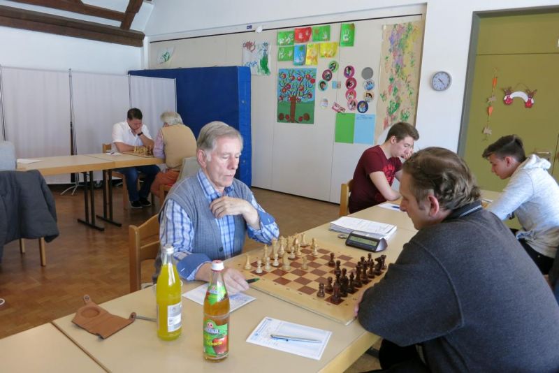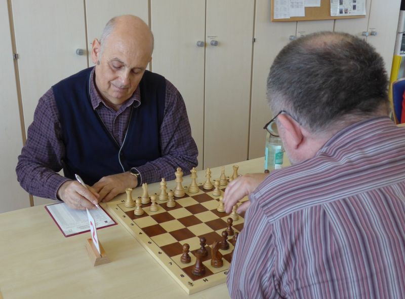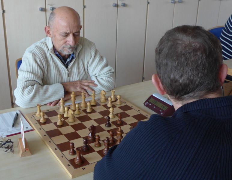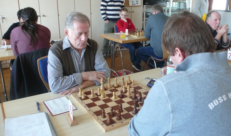 5 - Johann Kollmeder - Rainer Kutheil 1/2 Französisch, 29 Züge, 2:59 Std. Bis zum Endspiel keine Vorteile für eine Partei zu finden, also eine ausgeglichene Partie bei jeweils gleichem Läufer und sieben Bauern, man einigte sich auch hier auf ein friedliches Remis.