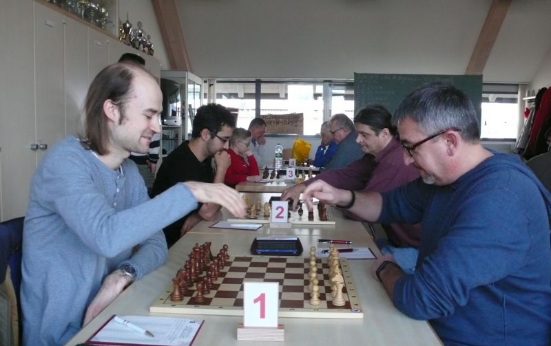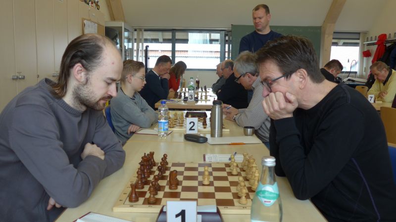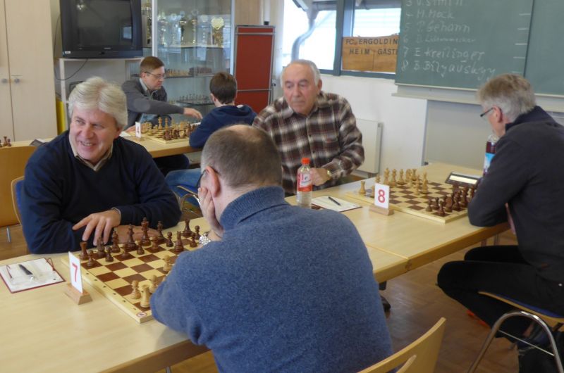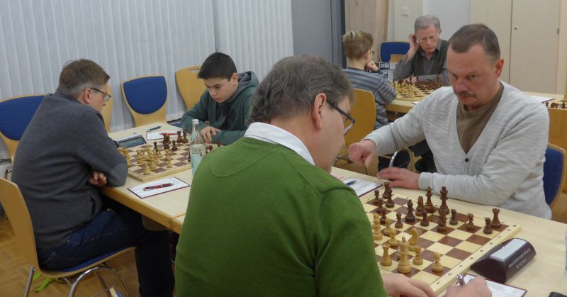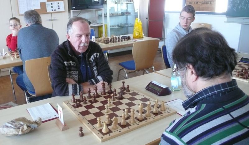 Es begann vielversprechend mit vollem Punktgewinn für Erich Kreilinger (Brett 6) bei seinem ersten Einsatz für Ergolding. Er zeigte bei seinem Königs-Inder Nervenstärke in einem schwierigen Endspiel, nach plötzlichem Figurenverlust musste sein Gegenüber die weisse Fahne hissen. Eine tadellose Vorstellung lieferte Nachwuchshoffnung Sebastian Astner (4) gegen ein Damenbauernspiel ab. Stellungsnachteile mit Zeitnotproblem seines Gegners brachten den Sieg für die Ergoldinger Habenseite. Waldemar Golder am Spitzenbrett hatte gegen eine Damen-Indische Verteidigung anzutreten. Das Ergebnis war eine friedliche Punkteteilung im frühen Mittelspiel in ausgeglichener Stellung. Am Brett von Vladimir Simin (2) bei einer Englischen Partie herrschte ebenfalls ein massives Zeitnotproblem in unübersichtlicher Stellung, jedoch auf der Ergoldinger Seite und das brachte schließlich den Verlust des Duells. Eine feine Angriffspartie zelebrierte Markus Mock (3) mit dem Thema geschlossener Sizilianer bei seinem ebenfalls ersten Einsatz für die Erste. Er eroberte zwei Mehrbauern im Mittelspiel und das brachte im Endspiel den Garaus seines Gegners. Ein fast beruhigender und überraschender Zwischenstand von 3,5:1,5 für Ergolding. Borys Bilyavskyy (7) wurde ein Skandinavier vorgesetzt. Auch hier im Verlaufe der Auseinandersetzung zwei Mehrbauern diesmal für den Gegner. Als im Endspiel der Ergoldinger auch noch eine Figur ohne Gegenleistung einstellte, erfolgte die sofortige Aufgabe. Daniel Lichtmannecker (5), als zweite Nachwuchskraft, war bis zum Schluss bei seinem Damenbauernspiel durch gute Partieführung klar auf mindestens Remiskurs, doch eine nicht korrekte Abwicklung im Endspiel ergab leider Figuren- bzw. Partieverlust, der Gastgeber schaffte doch noch den Ausgleich. Anton Königl (8), wieder gegen ein Damenbauernspiel, hatte es als letzter Mohikaner in der Hand, noch für ein positives Finale zu sorgen. Doch beide Kontrahenten hatten nur noch eine Leichtfigur und vier Bauern im Rennen und das reichte nur noch zum Remis bzw. zum 4:4 Endstand.