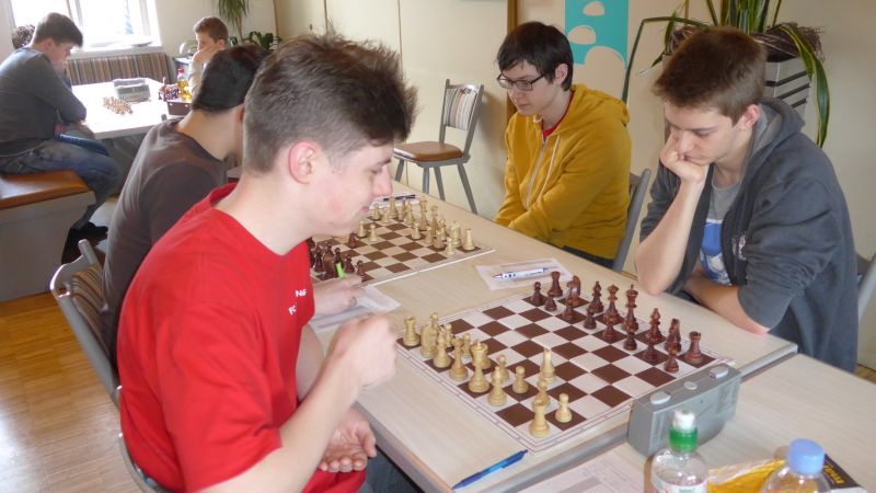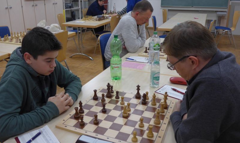 Ein etwas glücklicher 3:1-Sieg für die Zweite, die heuer als klarer DWZ-Favorit ihren Titel verteidigen will. Das 1:0 schaffte am Spitzenbrett Henrik Fesl (1643) erwartungsgemäß nach nur 1:14 Std. gegen Dimitri Alexandrov (1211), als ihm schon nach 17 Zügen ein Damengewinn gelang. Überraschend dagegen an Brett 4 der Sieg von Lukas Stessun (1063) gegen Felix Handschuh (1359), der im 7. Zug einen Bauer, und kurz darauf noch einen, gewann, dafür aber einen Springer einbüßte. Den kleinen Vorsprung rettete Lukas bis ins Endspiel und nach 2:33 Std. und 65 Zügen stand es 1:1. Auch Jonas Hammerl (986) wehrte sich an Brett 3 tapfer gegen Christoph Fronhöfer (1461), kam aber nach einem Fehler im 32. Zug auf die Verliererstraße. Im 39. Zug übersah er auch noch ein Matt in einem Zug und nach 2:35 Std. stand es 2:1 für die Zweite. Sehr spannend auch die Partie an Brett 2 zwischen Gabriel Mock (1476) und Aditya Tarade (1088). Im 13. Zug gewann Gabriel mit einer Fesselung einen Bauer, den er aber zurückgeben musste. Adi war dann eine Figur gegen zwei Bauern vorn, übersah dann jedoch im 25. Zug einen Damengewinn. Dann gings schnell, mit seinen Schwerfiguren schaffte Gabriel dann doch noch einen sicheren Punktgewinn durch Matt im 34. Zug nach 2:47 Std., damit 3:1.