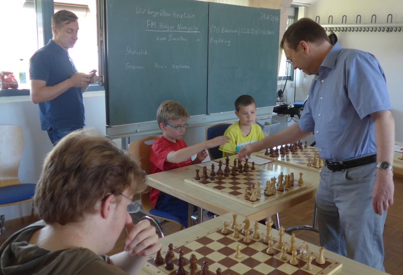 Abteilungsleiter Markus Mock lud seinen langjährigen Schachfreund FM Holger Namyslo (ELO 2226) zu einem Simultan gegen die Schachspieler des FC Ergolding ins Ergoldinger Bürgerhaus ein. Am Samstag war es soweit, der Fidemeister begann pünktlich um 10 Uhr gegen leider nur zwei Erwachsene, aber immerhin 12 Jugendliche und Kinder seine Simultan-Vorstellung und drehte seine Runden an den 14 Brettern. Wie üblich bei Simultan, mussten alle Ergoldinger mit den schwarzen Farben vorliebnehmen. An allen Brettern war Namyslos erster Zug e4. Überraschend durfte Sebastian Astner (1777 DWZ) schon nach weniger als 10 Minuten die Segel streichen, als er nach dem 10. Zug des Fidemeisters, einen Doppelangriff, vor der Wahl stand, Matt oder Springerverlust. Einige Zeit später mussten auch Gabriel Mock (1512), Ahmedcan Köle, Martin Vladimirov und Jakob Königsberger kapitulieren. Simon Lichtinger (1208) und Neuling Christian Teller hielten sich etwas länger. Irgendwann war es auch für Erich Kreilinger (1861), Jonas Hammerl (1622), Daniel Lichtmannecker (1787) und Anton Königl (1722) soweit, dass sie die Überlegenheit des Meisters anerkennen mussten. Der 9-jährige Christopher Jessen (1199) schaffte 50 Züge mit der Qualität weniger und der 10-jährige Tobias Hampel (noch ohne DWZ) hielt immerhin mit nur einem Bauer weniger, 43 Züge durch, bis er mattgesetzt wurde. Einzig der noch 15-jährige Dimitri Alexandrov (1444), vermochte nach gutem Spiel den halben Ehrenpunkt zu retten. Er providierte allerdings davon, dass der Fidemeister im 35. und 38. Zug den Gewinnzug übersah. Nach 43 Zügen und fast drei Stunden bot Dimitri in ausgeglichener Stellung Remis, was Namyslo auch sofort annahm. Danach gab es anhaltenden Beifall, sowohl für die fast makellose Vorstellung des sympathischen Fidemeisters, als auch für die gute Leistung von Dimitri. Alle waren sich einig, ein solches Event kann gerne wiederholt werden.