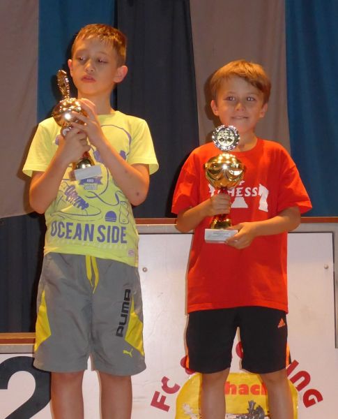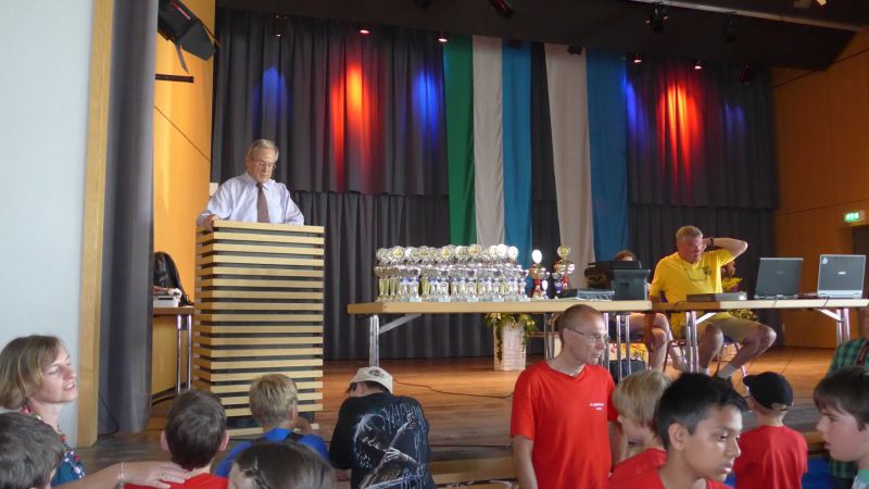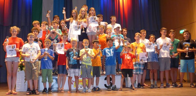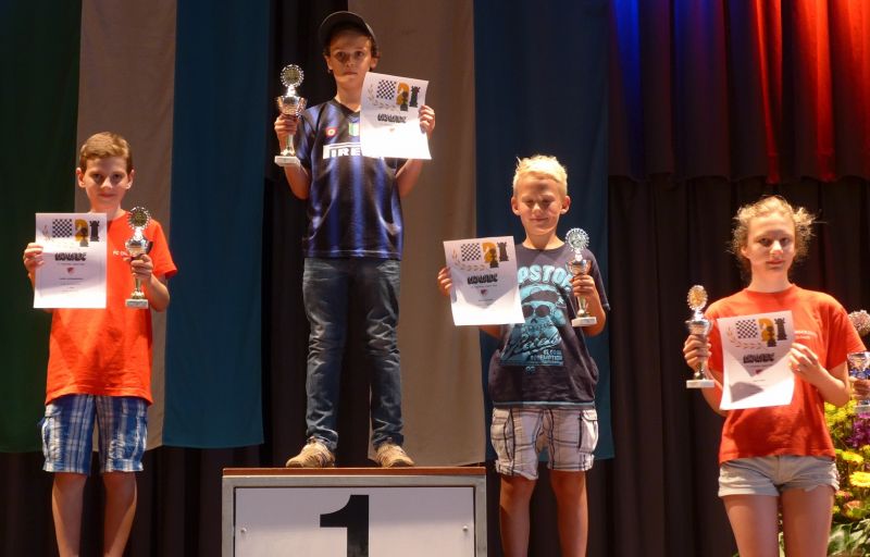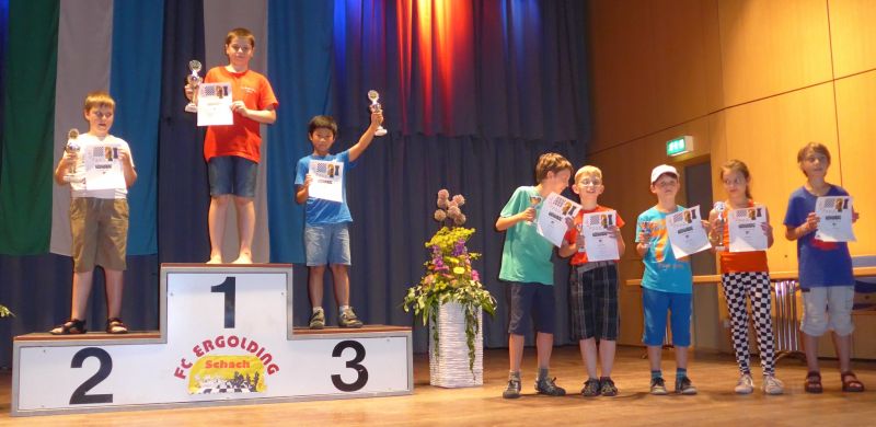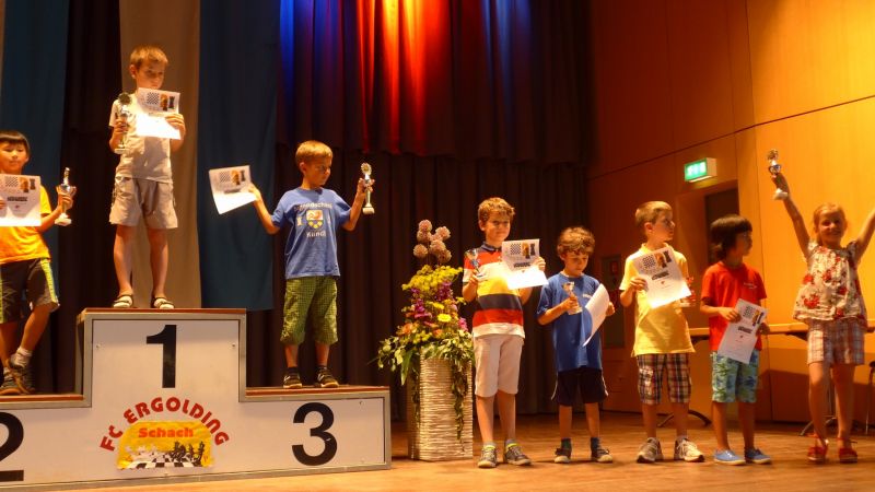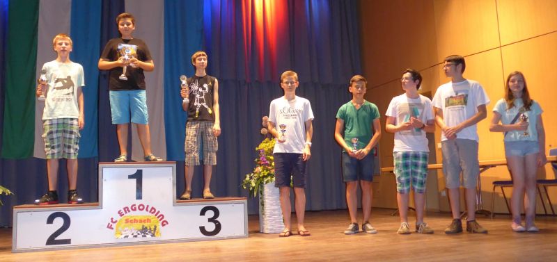 Die stimmungsvolle und zentral durchgeführte Ehrung mit dem großen Siegerpodest auf der Bühne war kurz nach 17°° zu Ende. Für die weiteste Anreise (einfach knapp 600 km), erhielt Eva Rudolph aus Düsseldorf ein Reiseschachspiel. Der jüngster Teilnehmer, Alexander Lohr aus Mainburg und die jüngste Teilnehmerin, Emily Alferova aus Fürstenfeldbruck, bekamen je einen Minipokal und ein Schachheft. Der SV Röhrnbach und der PSV Dorfen wurden mit je einem Pokal für den Verein mit den meisten Teilnehmern (diesmal beide je 12) ausgezeichnet, auf den der Gastgeber FC Ergolding (28 Teilnehmer) natürlich wie immer verzichtet. Dann ging's zur Ehrung der jeweiligen Klassen. Die ersten Acht jeder Altersklasse und das beste Mädchen wurden zum Siegerpodest auf die Bühne gebeten. Die ersten Drei und das beste Mädchen erhielten Pokale, die Vierten bis Sechsten Minipokale und die ersten acht Urkunden. In den Klassen U8 und U10 bekamen alle Teilnehmer eine "Ich war dabei!" -Urkunde.