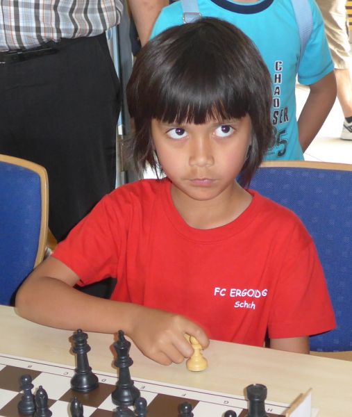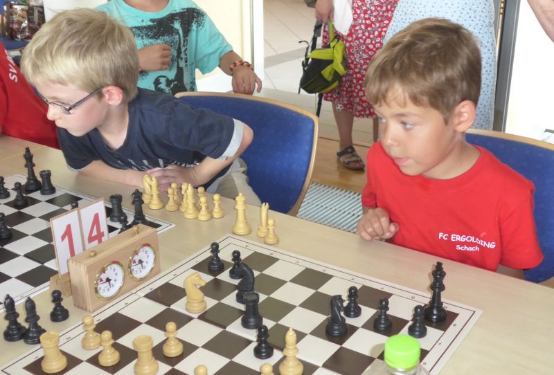 Ein spannender Verlauf wieder bei den Kleinsten in der U8-Klasse mit 30 Teilnehmern: Vorjahressieger Brian Gan (SK Kolbermoor, 1004 DWZ) besiegte in der 5. Runde den Österreicher Robert Kruckenhauser (978) und traf in der letzten Runde auf Denis Werner (SC Garching). Der Garchinger gewann und fing Brian gerade noch ab; bei Punktgleichheit von je 18 Punkten entschied die Buchholz mit 97:88 für Denis. Dritter wurde Kruckenhauser mit 15 Punkten. Der erst 7-jährige Ergoldinger Simon Lichtinger kam zum ersten Mal in die Top-Ten und wurde mit 4 Siegen und einem Remis ausgezeichneter Achter, noch vor dem Altötting-Sieger Florian Fuchs (DJK SV Haselbach). Den Mädchenpreis gewann Emily Alferova (TuS Fürstenfeldbruck) mit 12 Punkten. Nach genau 10 mal Training belegte das Ergoldinger Kindergartenkind Christopher Jessen mit auch schon zwei Siegen den 26. Platz. Seine erste Frage danach war: "Wann ist das nächste Schachturnier?"