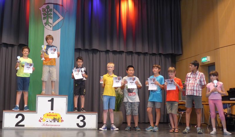 Kleine Episode am Rande: Alexander Lukes (SK München Südost, 917 DWZ, Jahrgang 2011, noch 5 Jahre alt) wurde hervorragender Siebter unter den 39 Teilnehmern! Da ja die ersten Sechs mit Pokalen ausgezeichnet werden, und ausgerechnet auf Platz 8 auch noch das beste Mädchen den Mädchenpokal erhielt, stand der kleine Alexander als einziger ohne Pokal auf der Bühne. Sein kleiner Preis, ein DVD-Kinderfilm, und die Urkunde für den 7. Platz waren natürlich nur ein schwacher Trost. Dies wird zum Anlass genommen, künftig auch noch den besten U6-Spieler mit einem kleinen Pokal zu ehren!