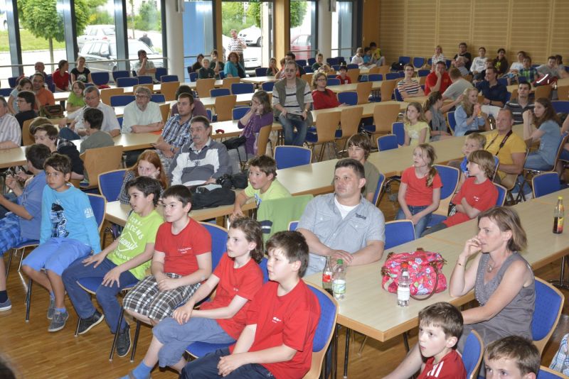 Der Termin kurz nach den Pfingstferien war etwas ungünstig gewählt. Trotzdem war das Turnier mit 170 Teilnehmern (im Vorjahr 205) aus 46 Vereinen ganz gut besucht. Bei drei bayerischen Rapidturnieren waren weniger Teilnehmer zu verzeichnen. Auch heuer waren zwei Österreicher, diesmal aus Tirol, am Start. Nach dem um etwa 25 Minuten verspäteten Start durch etliche Nach- und Ummeldungen verlief das Turnier reibungslos und dank der hervorragenden Leitung des Spielleiters und seiner fleißigen Assistentin Anna Klinkenberg war die letzte Partie gegen 16:15 beendet und kurz darauf lagen um 16:30 die Urkunden zur Siegerehrung bereit. Die stimmungsvolle und zentral durchgeführte Ehrung mit dem großen Siegerpodest auf der Bühne war schon vor 17°° zu Ende. Für die weiteste Anreise (einfach 196 km, knapp vor Burlafingen mit 194 km) erhielten die Tiroler aus Kundl ein Reiseschachspiel. Jüngster Teilnehmer war Marc Burda vom SC Vaterstetten, jüngste Teilnehmerin Melina Gilhuber vom SK Töging. Beide bekamen einen Minipokal und ein Schachheft. Der SC Moosburg holte sich, wie in jedem Jahr, den Pokal für den Verein mit den meisten Teilnehmern (diesmal 10), auf den der Gastgeber FC Ergolding (28 Teilnehmer) natürlich wie immer verzichtete. Auch der Verein mit den drittmeisten Teilnehmern, der SK Gräfelfing (9), erhielt einen Pokal. Dann ging's zur Ehrung der jeweiligen Klassen und die ersten Acht jeder Altersklasse und das beste Mädchen wurden zum Siegerpodest auf die Bühne gebeten. Die ersten Drei und das beste Mädchen erhielten Pokale, die Vierten bis Sechsten Minipokale und die ersten acht Urkunden. In den Klassen U8 und U10 bekamen alle Teilnehmer eine "Ich war dabei!" -Urkunde.