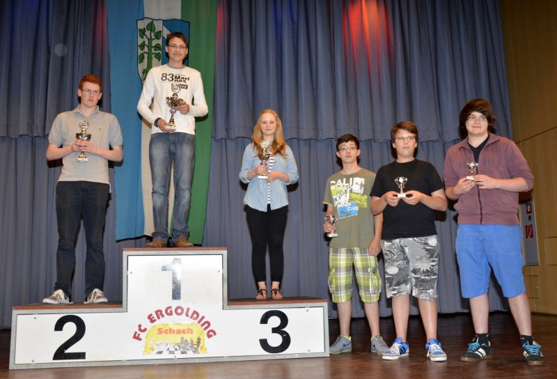 29 Teilnehmer starteten bei der U14-Klasse. Turniersieger wurde überraschend Eric Gabler (TV Geiselhöring, 1520), der sich ungeschlagen nach fünf Siegen und zwei Remis mit 17 Punkten ins Ziel rettete. Knapp dahinter, ebenfalls unerwartet, mit 16 Punkten Claudio Longo (SK Germering, 1438), der davon profitierte, dass sich die drei folgenden Spieler des SC Bavaria Regensburg Cédric Oberhofer (1828), Marie Oberhofer (1374), und Georg Dechant (1672), untereinander die Punkte teilten. Und bei der Dreipunktewertung sind zu viele Remis natürlich nachteilig. Auf Rang 6 folgte Henrik Fesl (FC Ergolding, 1451), dem in der letzten Runde ein Remis gegen Dechant gelang, knapp vor der Bayerischen U14-Meisterin Dilan Hacklinger (SK Buchloe, 1311) und Chulian Neuwerth (SC Castra Batava Passau, 1410). Marie Oberhofer wurde als Vierte mit dem Mädchenpokal ausgezeichnet. Die beiden Ergoldinger Cora Klinkenberg (1243) und Christoph Fronhöfer (1106) können mit den Plätzen 13 und 17 zufrieden sein.